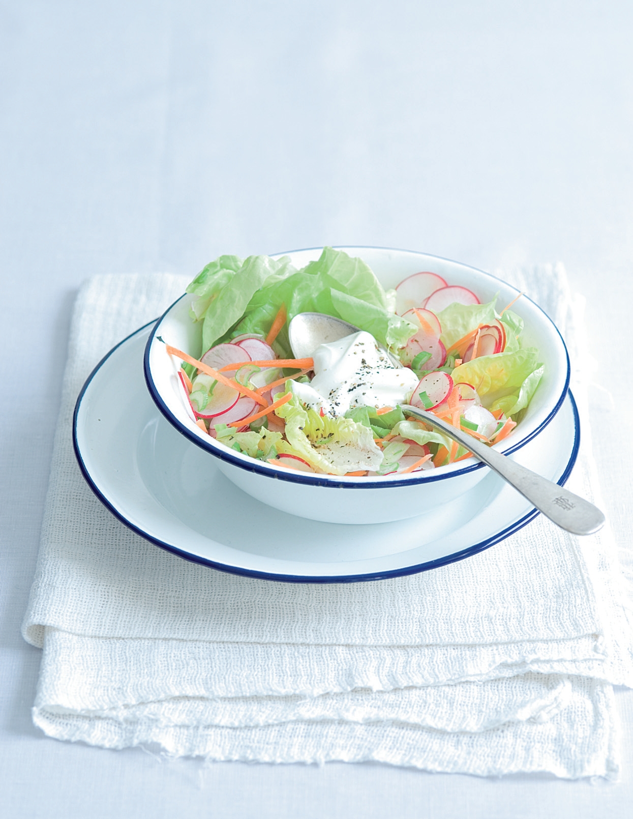 Osvěžující salát. Ostřejší chuť ředkviček zjemníte zakysanou smetanou.