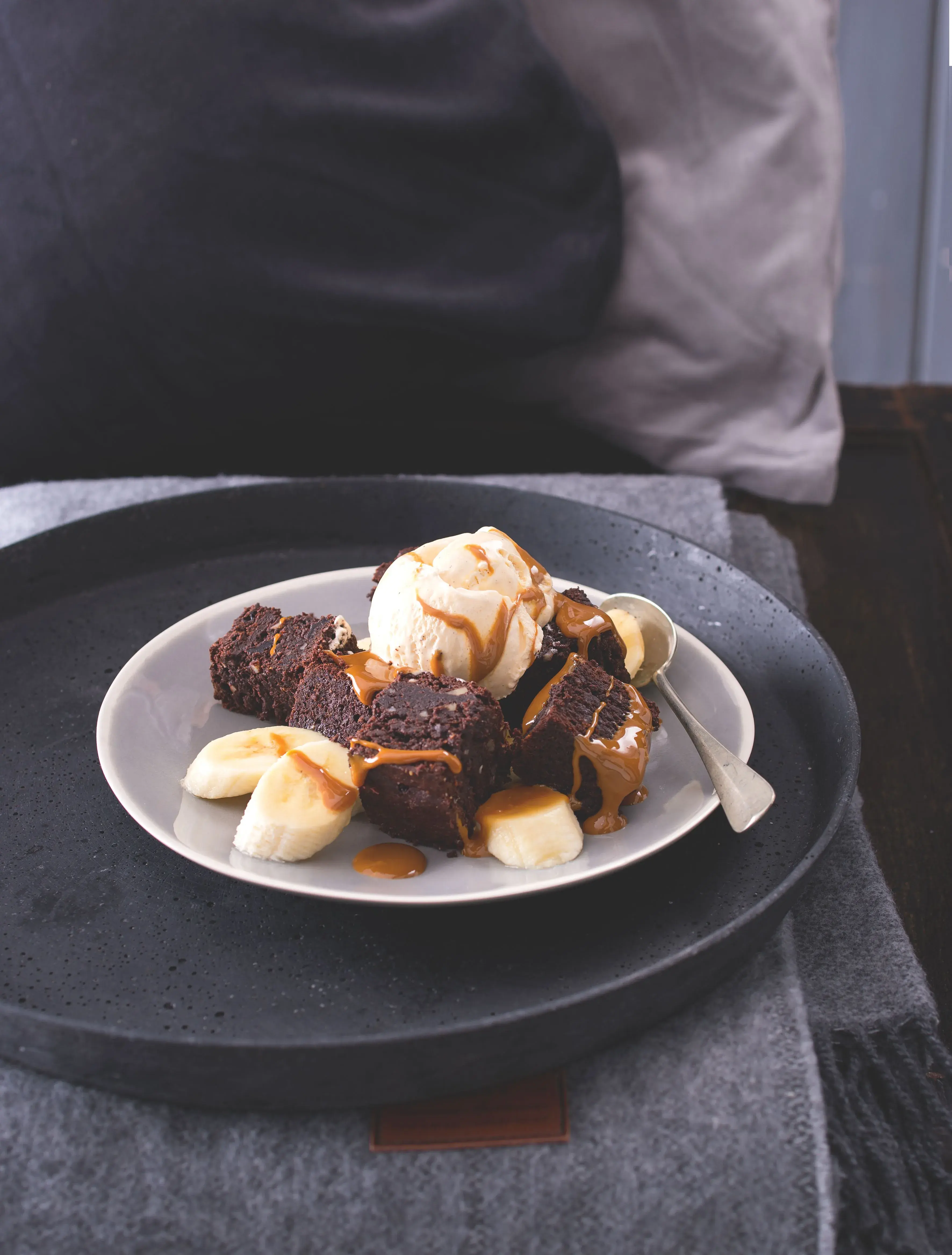 Tohle je rozmazlování v opravdu velkém stylu. Už samotné kousky brownies vás vynesou do závratných výšin, ale přidejte zmrzlinu, banány a karamel a jsou z toho hotová nebesa.