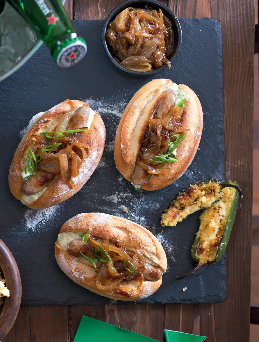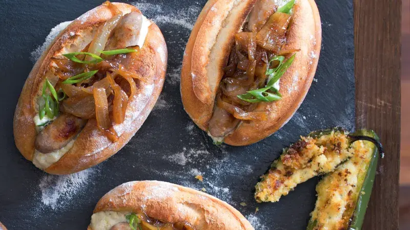 Klasický hot dog, který k fotbalu prostě patří, jsme vylepšili cibulkou a omáčkou.
