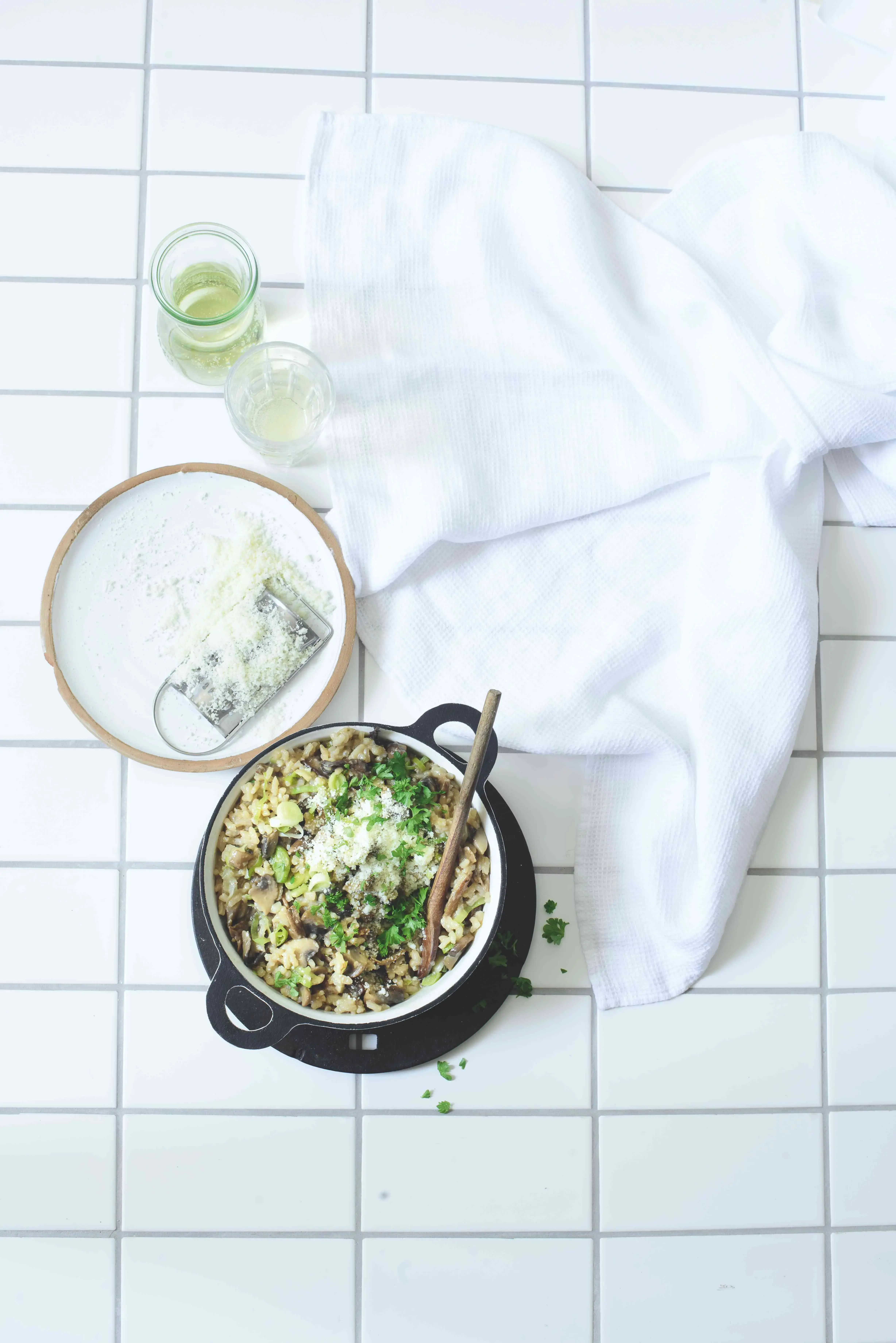 Množství rýže vzhledem k houbám a pórku se při nasypání do hrnce může zdát mizivé, ale nemusíte se obávat - pokud použijete skutečně rýži arborio, zase se objeví.