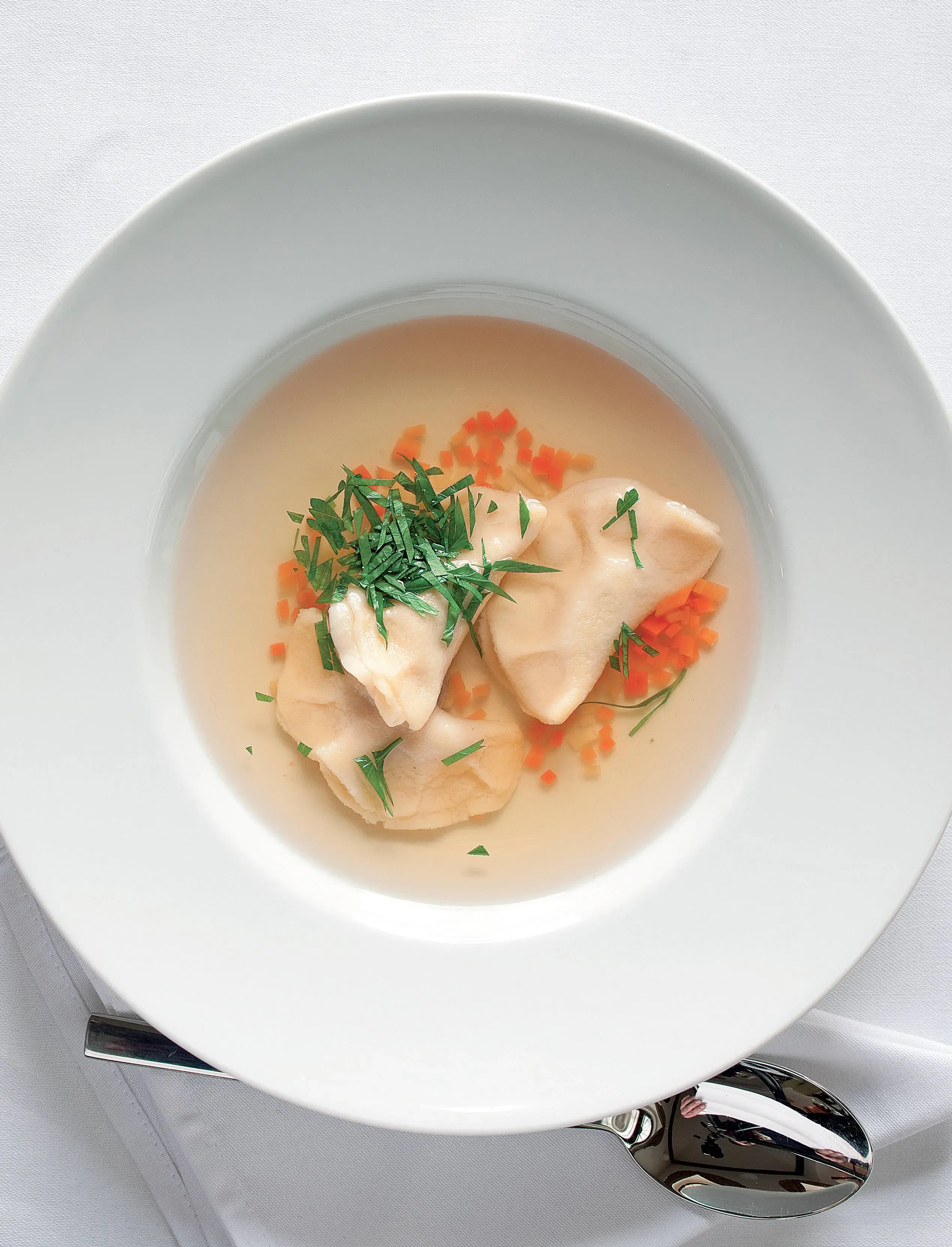 Poctivý a silný vývar je základ, říká šéfkuchař restaurace Amade Radek Benetka. A játrové ravioly rafinovaně spojují tradiční zavářku a domácí těstoviny. Vývar se vaří dlouho, proto se ho doma vyplatí připravovat ve větším množství. Pokud ho všechen nesníte, zbytek zamrazte.