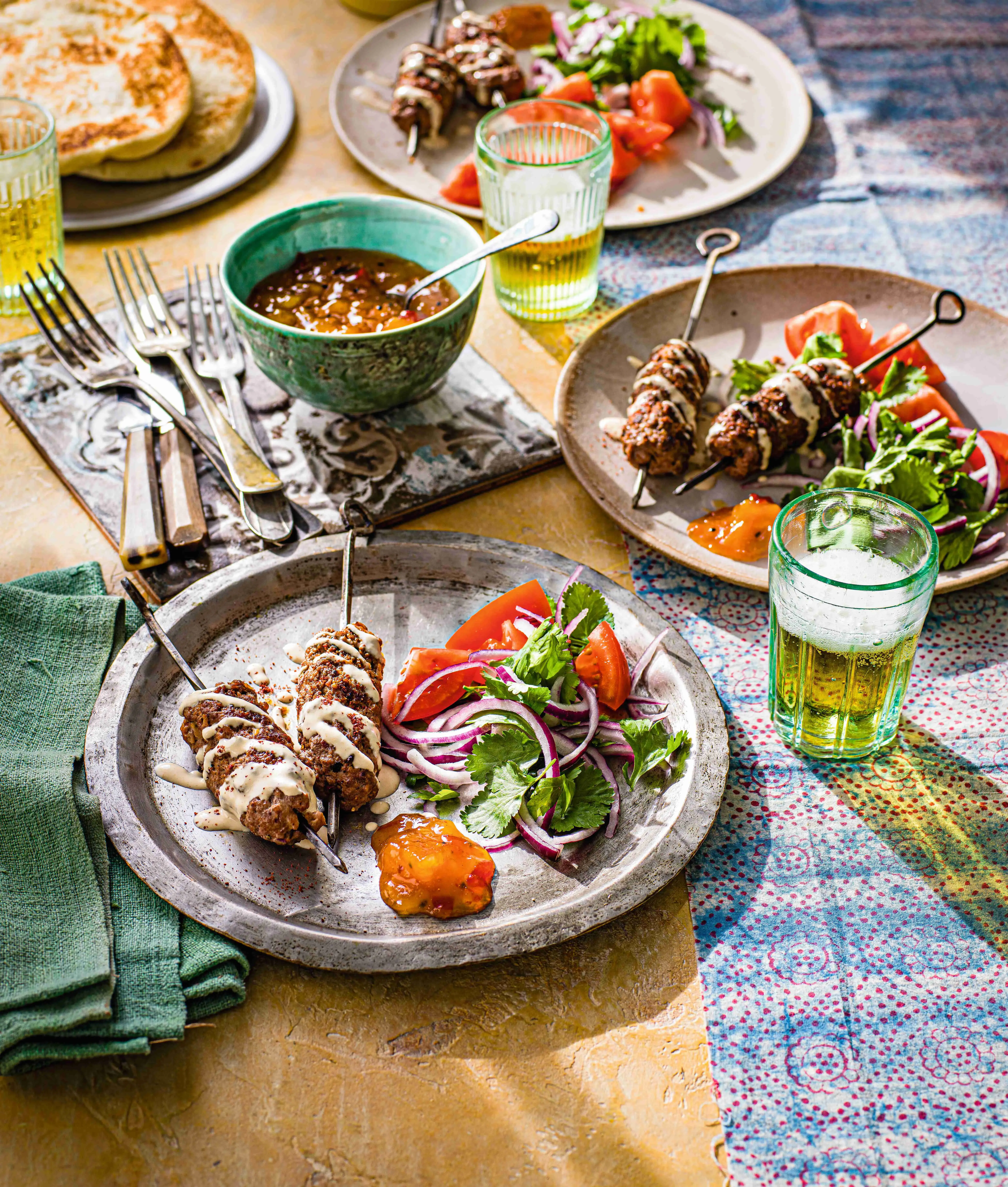 Tradičně se tyhle kofty servírují s omáčkou amba, vyrobenou z naloženého nezralého manga. Mangové čatní je za ni důstojná náhrada. Dejte pozor, ať se z čatní do masové směsi na kofty nedostanou velké kusy manga – ty si naopak schovejte k podávání.