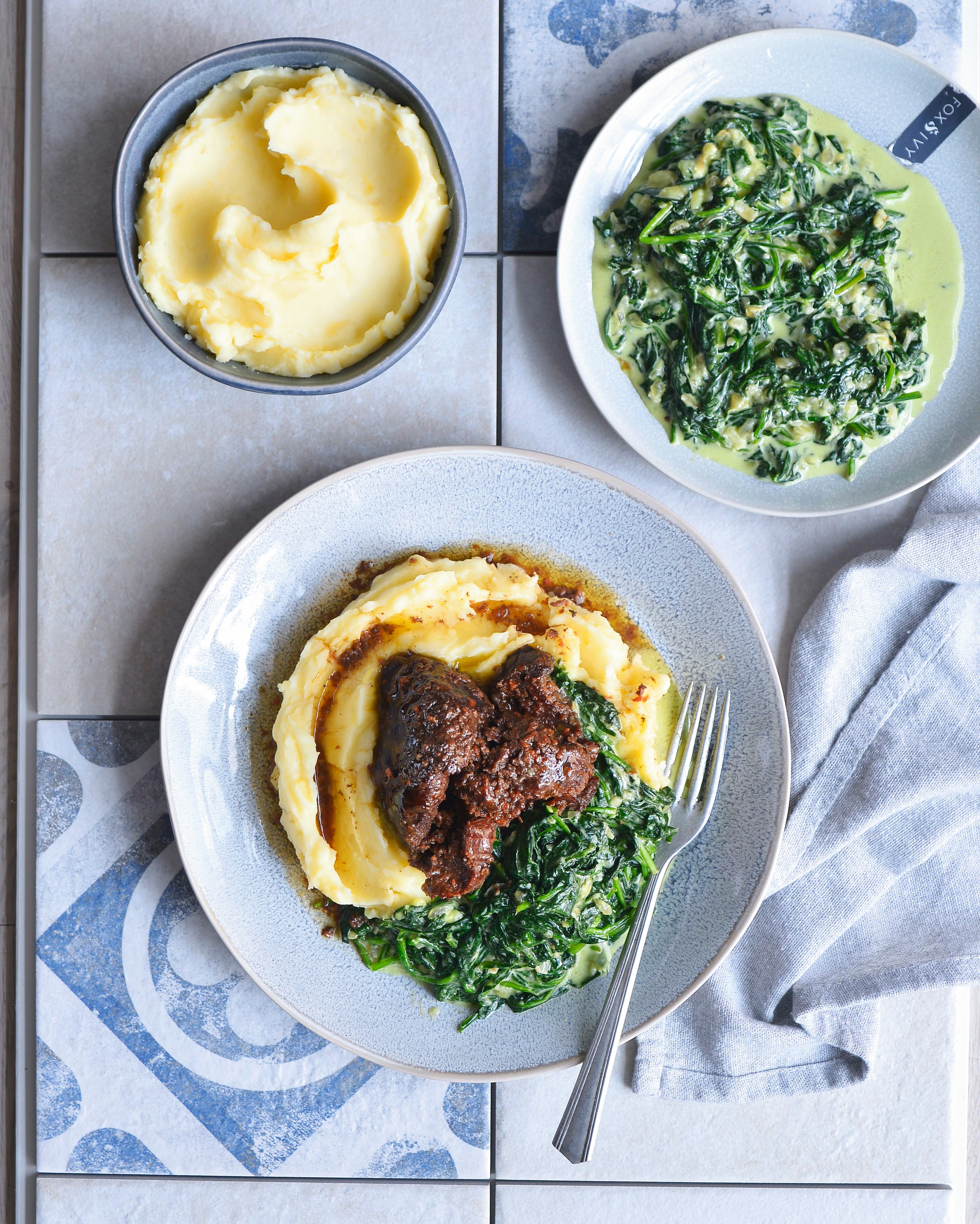Hovězí líčka s bramborovou kaší a smetanovým špenátem je honosná večeře připravená do pár minut. S hotovými líčky máte uvařeno raz dva!