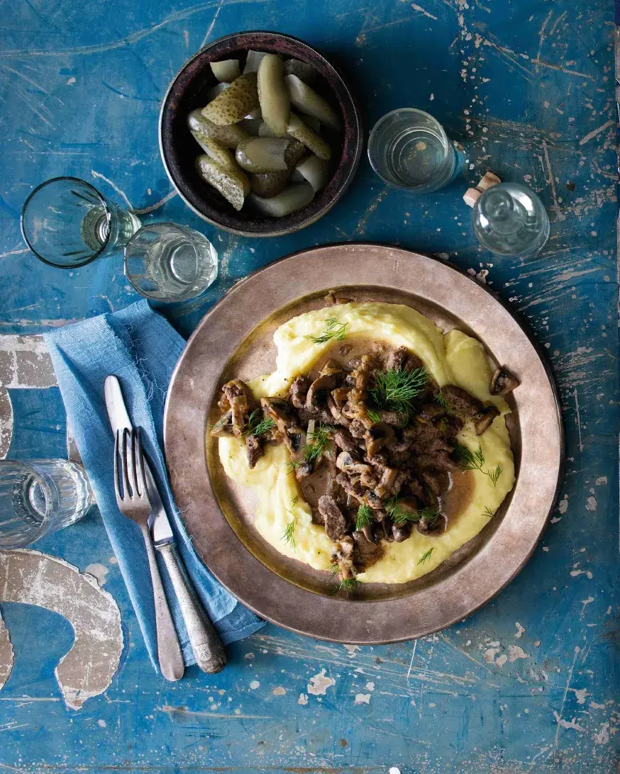 Říká se mu také hovězí Stroganoff – podle francouzského boeuf Stroganoff – a bylo nazváno na počest některého z členů vlivného ruského šlechtického rodu Stroganovů. Tradičně se do ,stroganovu‘ přidává hořčice a/nebo rajský protlak. Nás zaujala verze ruského blogera s přezdívkou Andy Chef, jež vynechává obojí. Jako přílohu jsme však nezvolili široké nudle jako on, ale bramborovou kaši.
