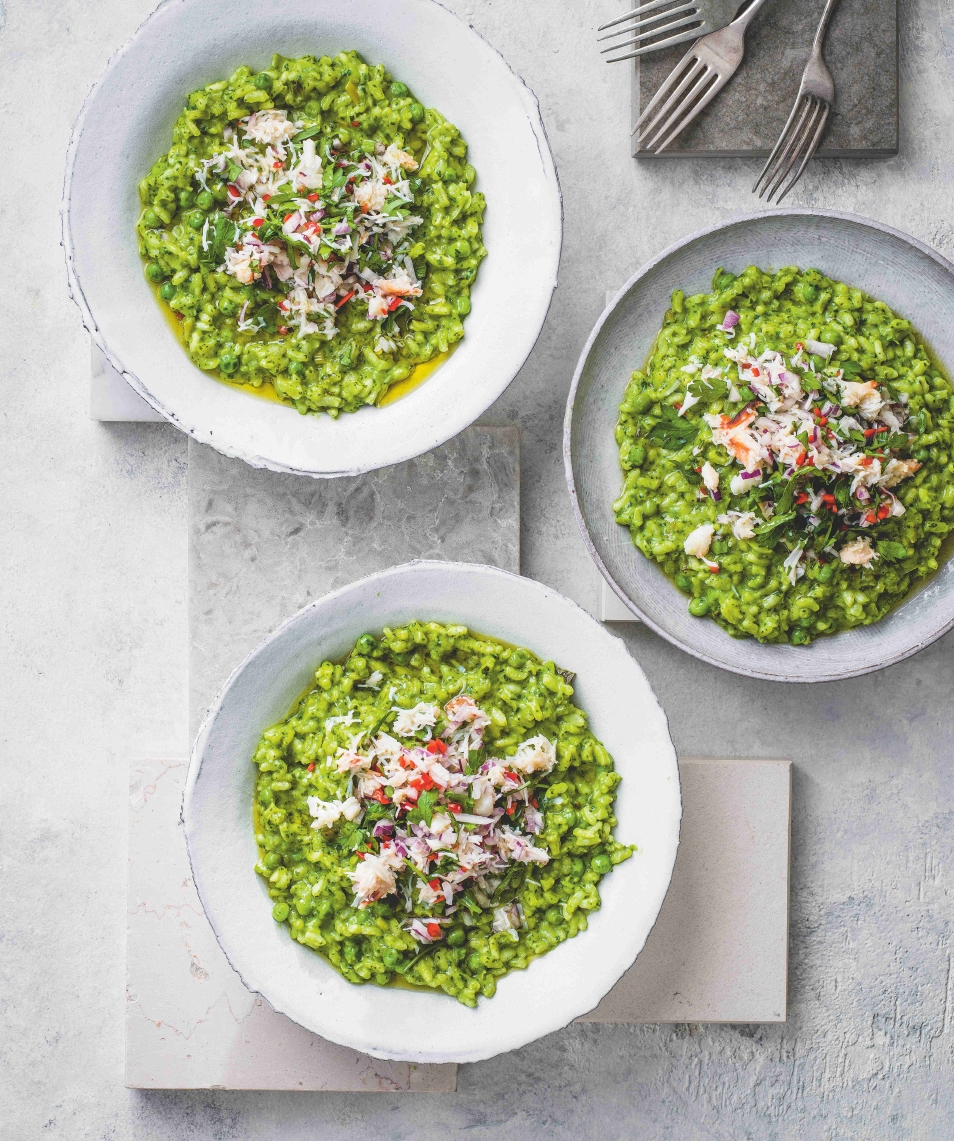 Jak vypadá jaro na talíři? Třeba jako svěže zelené hráškové rizoto! Je skvělé samo o sobě, ale pokud mu chcete dodat trochu šťávy navíc, doplňte ho pikantní krabí salsou.