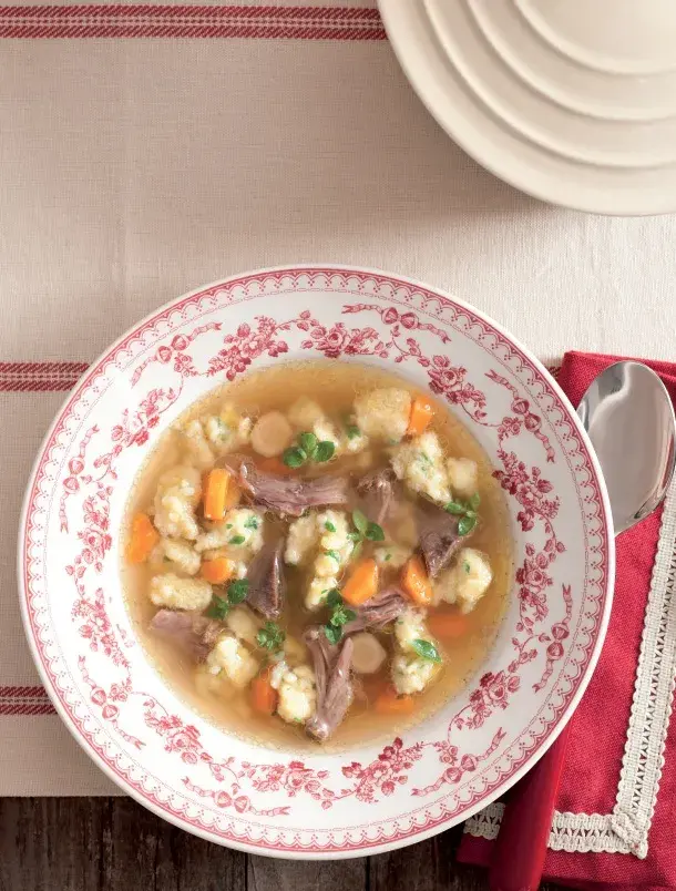 Husí vývar je o dost výraznější než kuřecí. O další stupeň ho pozvednete, když ho budete vařit ze skeletu zbylého z pečínky. Vznikne tak silný základ pro chuťově bohatou polévku s bylinkovým kapáním, zeleninou a kousky masa. Sytý a vydatný chod, jako stvořený pro posvícení nebo jiné sváteční chvíle.