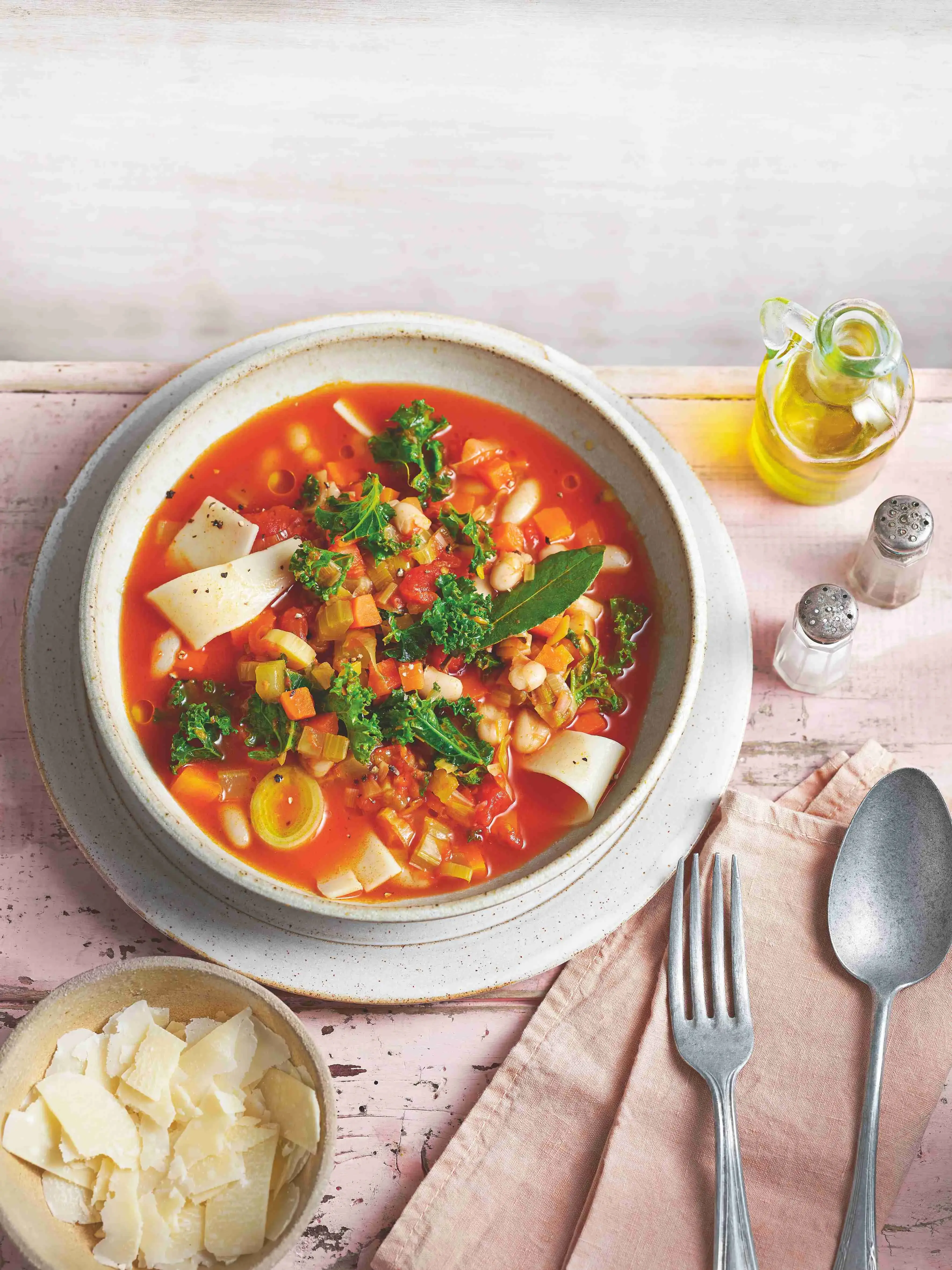 Skvělá polévka, která zužitkuje nálev z konzervy fazolí i polámané pláty lasagní. Máte-li, klidně nechte v polévce vyvařit kůrky parmazánu.