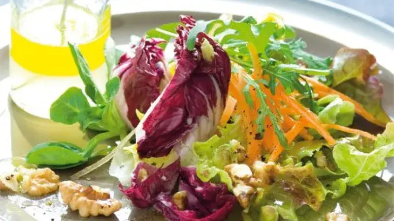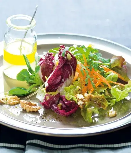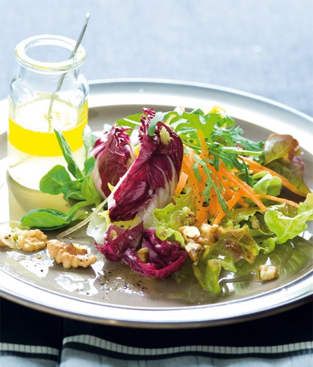 Salát z mladých lístků s ořechy a lehkou zálivkou strčí do kapsy všechny komplikované předkrmy! Jen pečlivě vybírejte lístky, důkladně je propláchněte a pak osušte, ideálně v odstředivce. Dělá to tak i italský šéfkuchař Emanuele Ridi, od kterého máme tento recept.