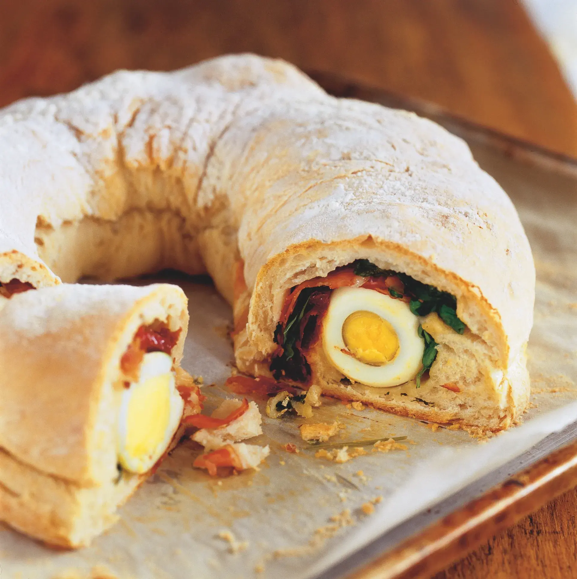 Italská inspirace se projevuje v základním těstu na tamní bílý chléb a nezapře se ani v náplni závinu. Italský chlebový věnec s vejci ‚Torta pasqualina‘ je nejen krásnou ozdobou velikonočního stolu, ale i chutnou slanou pochoutkou, kterou si zamiluje celá rodina. Nadýchané těsto, zapečená vejce a jemně kořeněná náplň z něj dělají ideální velikonoční pečivo. Skvěle chutná i studený!