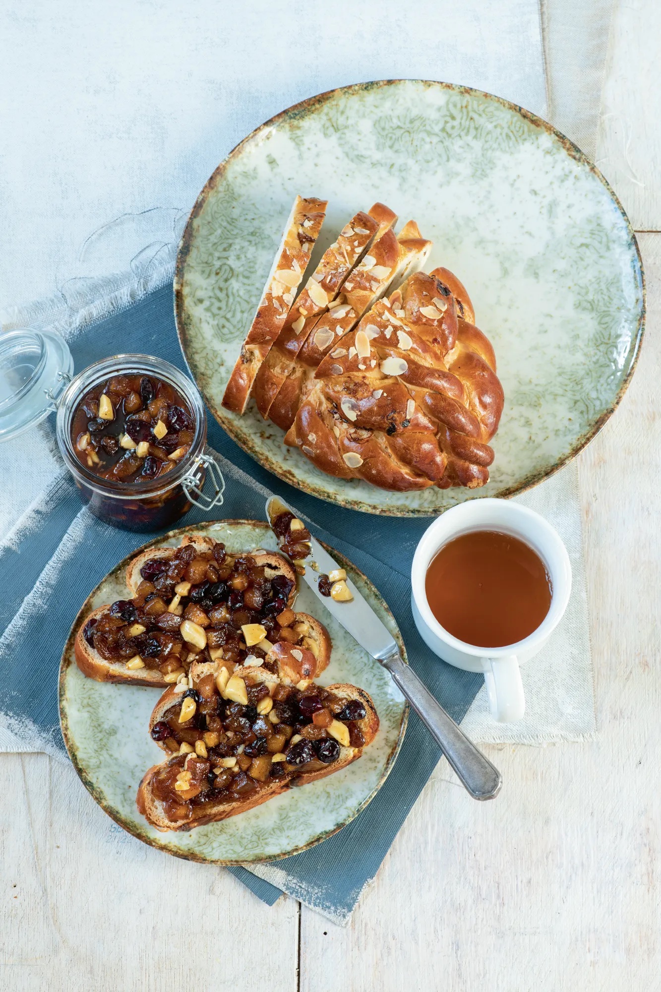 Jablečný džem plný rozinek a oříšků už teď dokáže navodit tu pravou vánoční atmosféru. Nejlépe hutná na vánočce nebo jiné sladké briošce. Skleničky s jablečným karamelovým džemem se hodí i jako jedlý dárek.