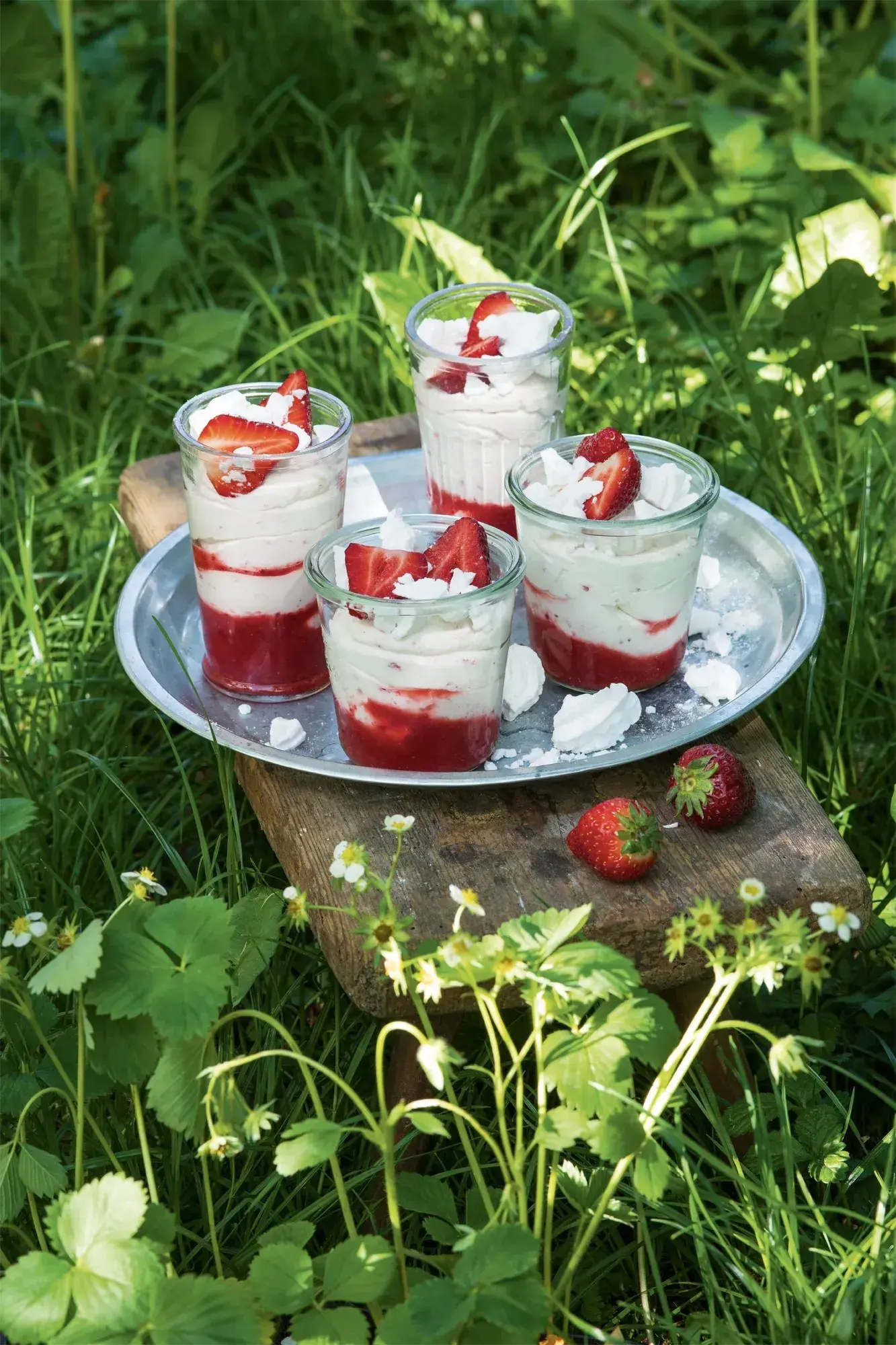 Jednoduchý jahodový dert do skleničky ve stylu slavného Eton mess, tedy spojení čerstvých jahod, smetany a sněhových pusinek. Recept je jako stvořený pro horké letní dny, kdy se vám nechce stát u rozpálené trouby a zároveň máte chuť na osvěžující dezert. Ozdobte ho mátou, meduňkou nebo třeba kousky čokolády.