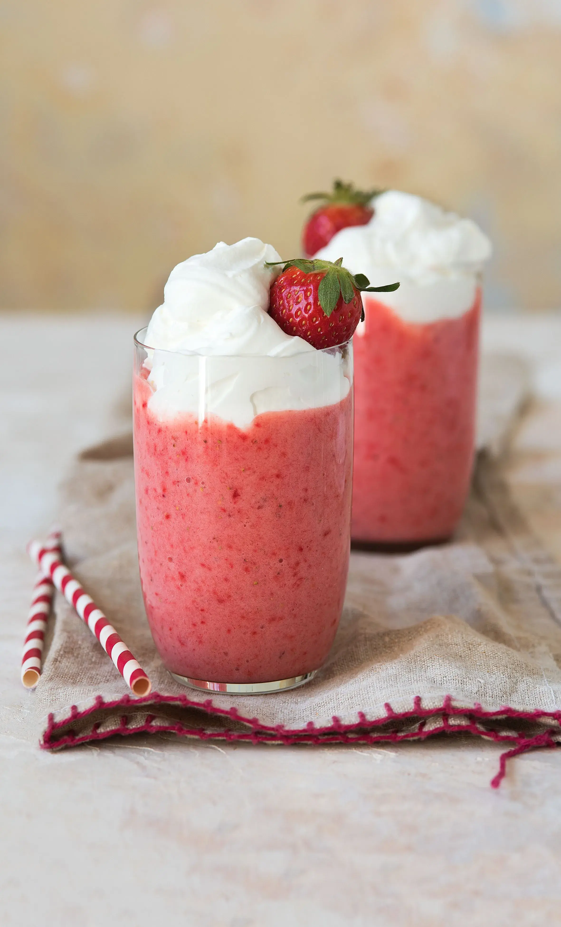 Tahle chladivá slast ve skleničce vám připomene slávu mléčných barů. Jahodovo-banánový koktejl s čepicí šlehačky a prohovaným brčkem vás bleskově přenese do dětství...