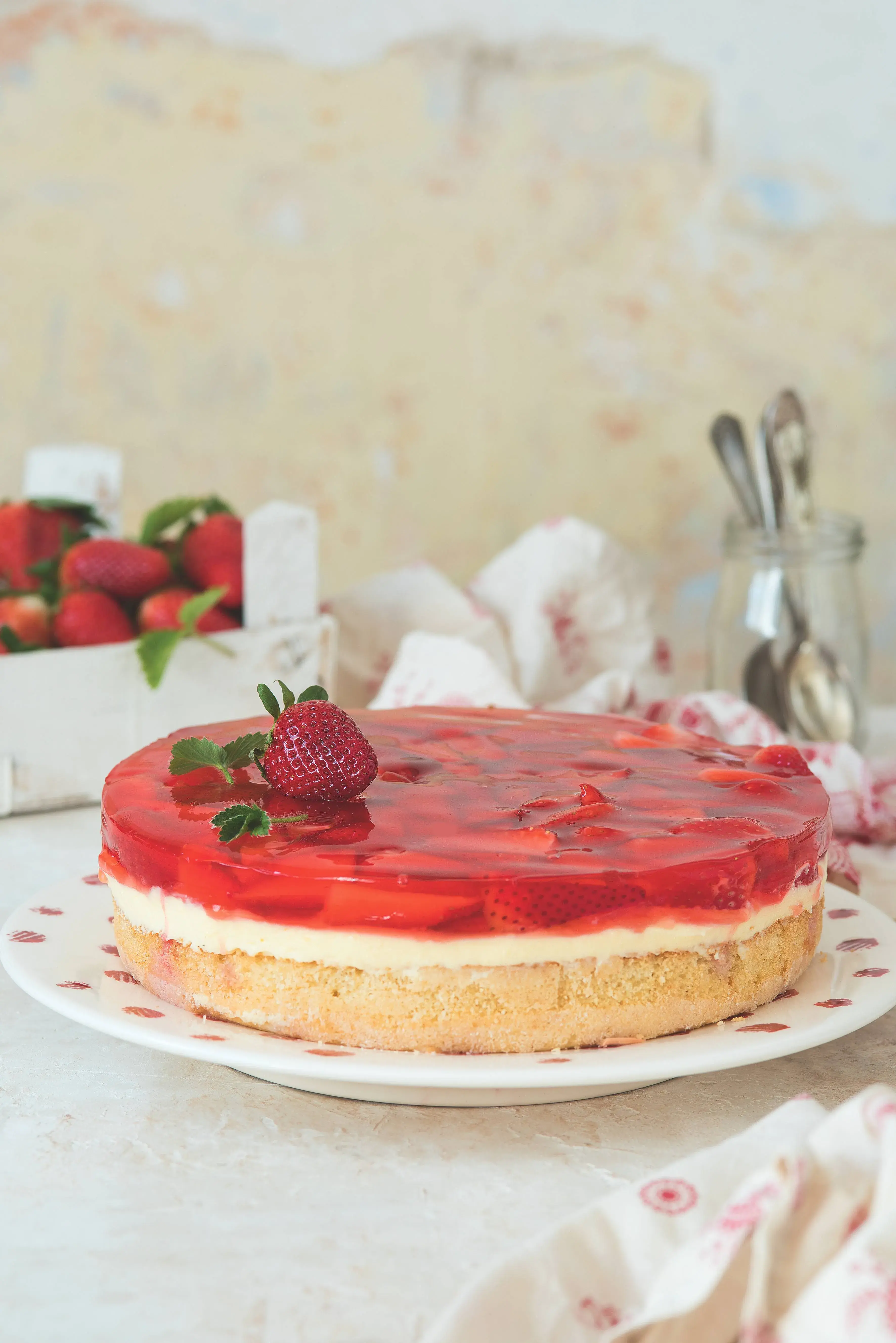 Piškot, vanilkový pudink a pořádná vrstva jahod pod sklem. Tak prosté, a přitom efektní a naprosto dokonalé! Chcete-li dort ještě o trošičku vylepšit, přidejte pod pudink poctivou vrstvu domácího džemu. Samozřejmě jahodového. Jahodový dort jak vyšitý.