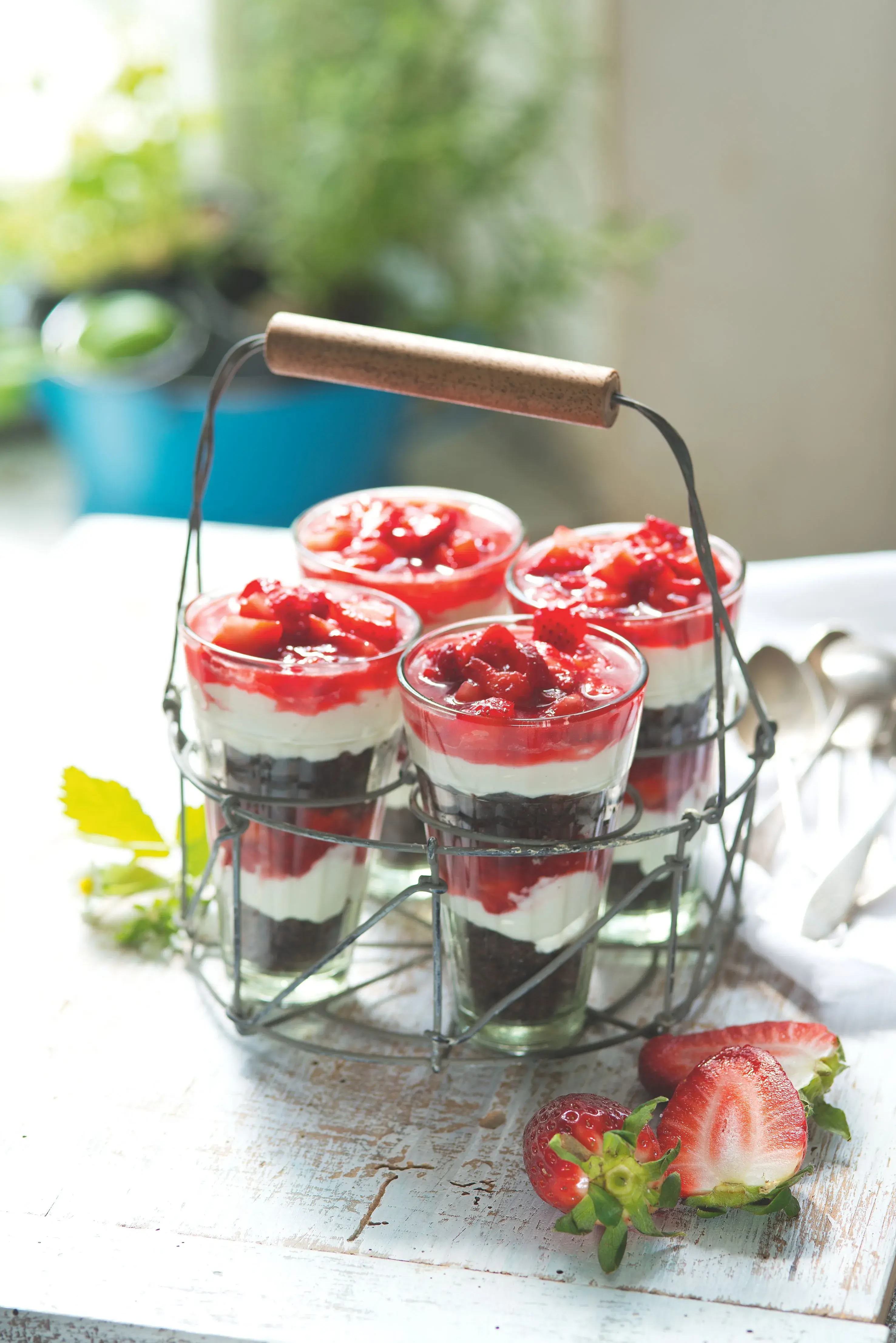 Na klasického míšu nedáme dopustit. Spojení čokoládového těsta a tvarohového krému je zkrátka legendární. Ovšem pro tentokrát jsme čokoládovou polevu nahradili jahodovým pyré a všechno schovali do skleniček – vznikl tak jahodový dezert do skleničky, ideální na letní piknik! Stačí zavíčkovat a uložit do košíku.