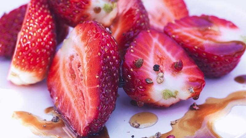 - Jahody z šéfkuchařovy zahrádky na pepři, medu a skořici, kysaná biosmetana