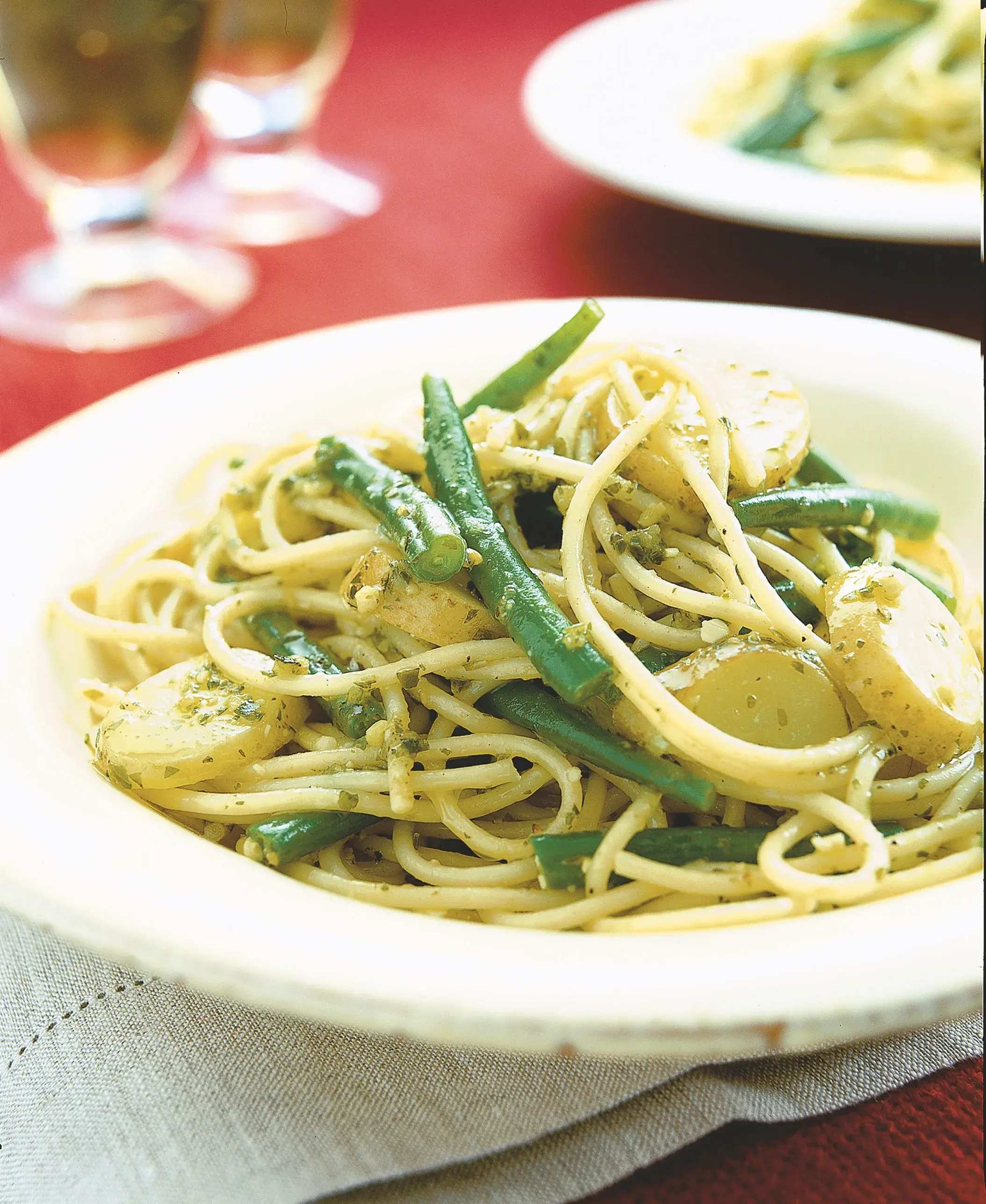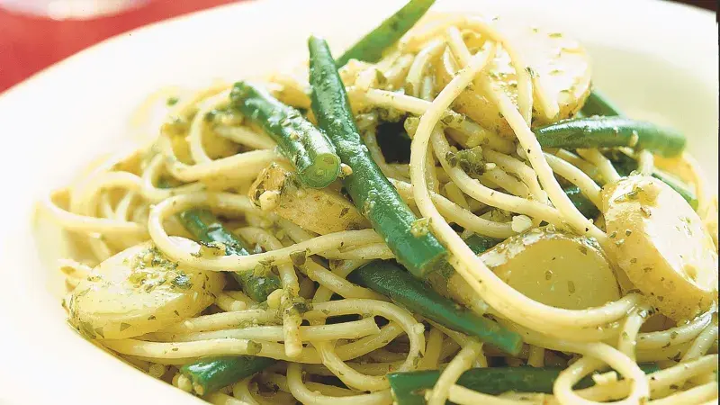 Kombinace těstovin a brambor se může zdát zvláštní, ale díky aromatickému pestu (dobře ho uchováte v chladu a jedna lahvička vám vydrží na několik použití), pokrm výrazně získá na zajímavosti.