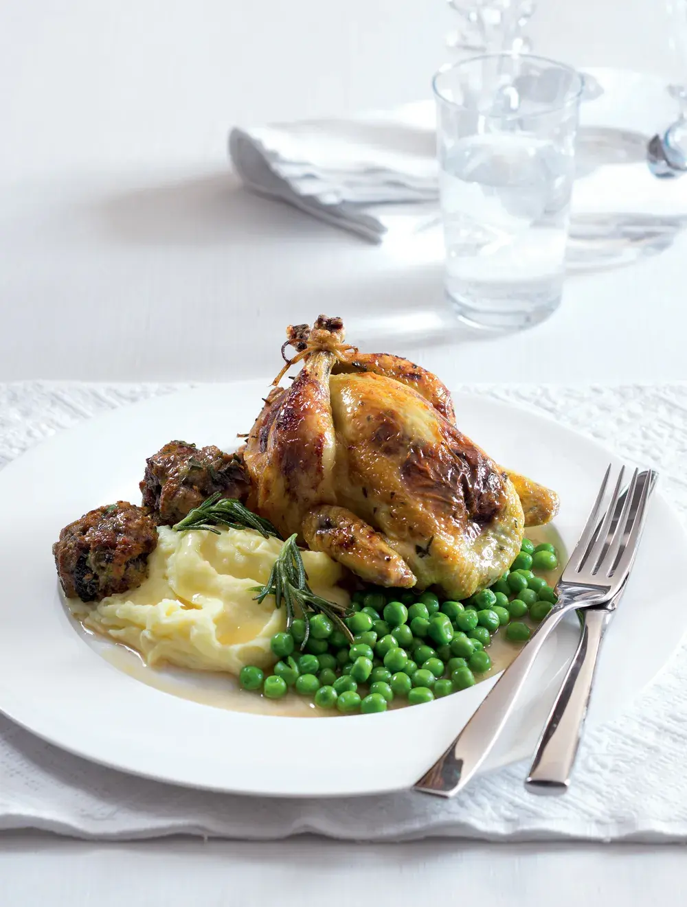 Jedno kuře, jedna porce... Pečené jarní kuřátko s nádivkou, hráškem a bramborovou kaší je super recept na nedělní oběd. Nebojte se slaniny ani másla, jarní kuřátko se snadno vysuší a tito pomocnici tomu snadno zabrání.