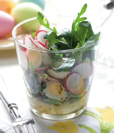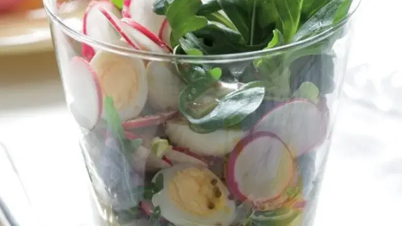 Zeleninový salát s teplými křepelčími vajíčky podávejte jako předkrm. Přidat k němu můžete rozpečenou bagetku.