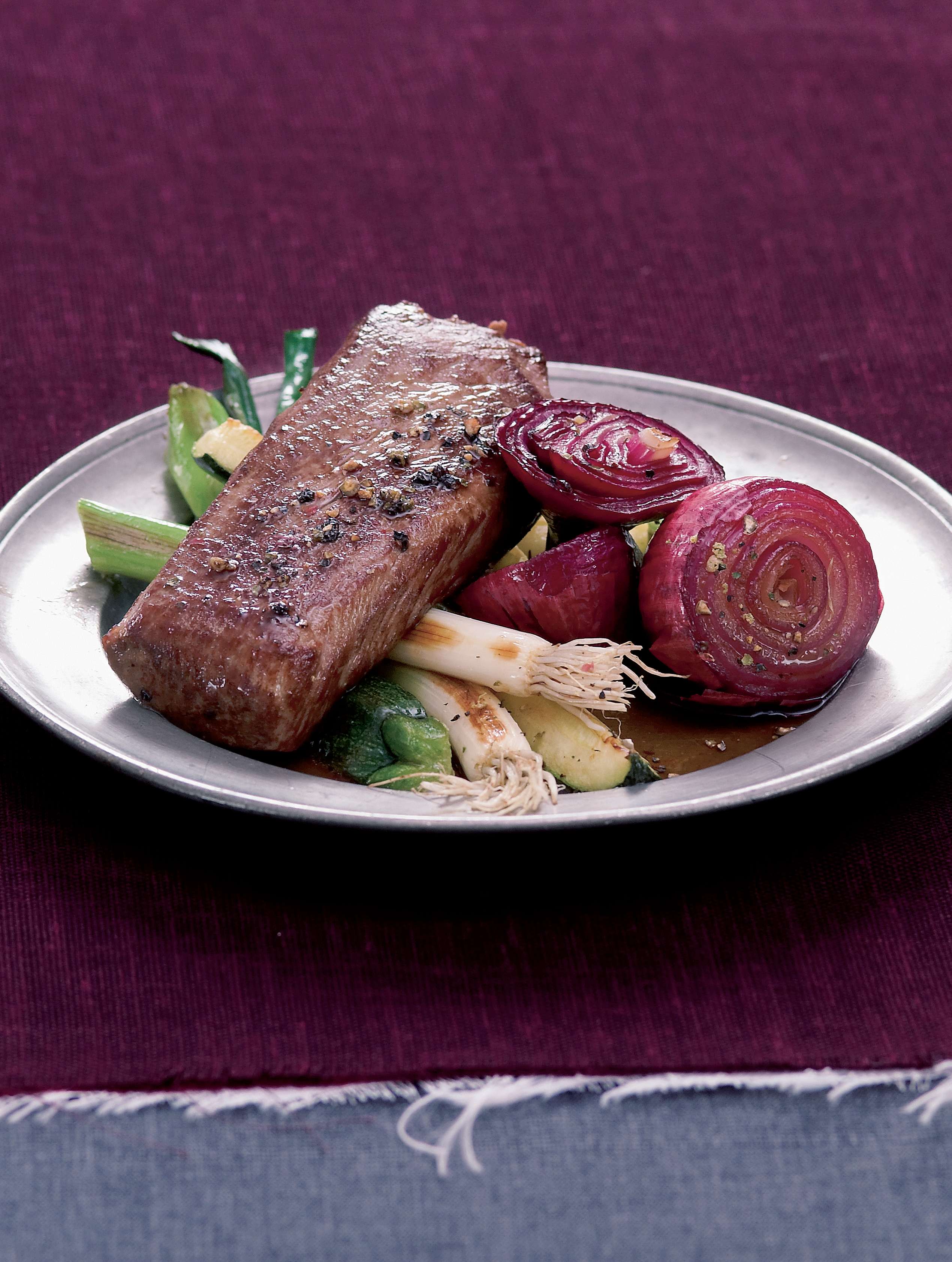 Pečené jehněčí s jarní cibulkou, česnekem a cuketou. Chuť dolaďuje sladký javorový sirup.