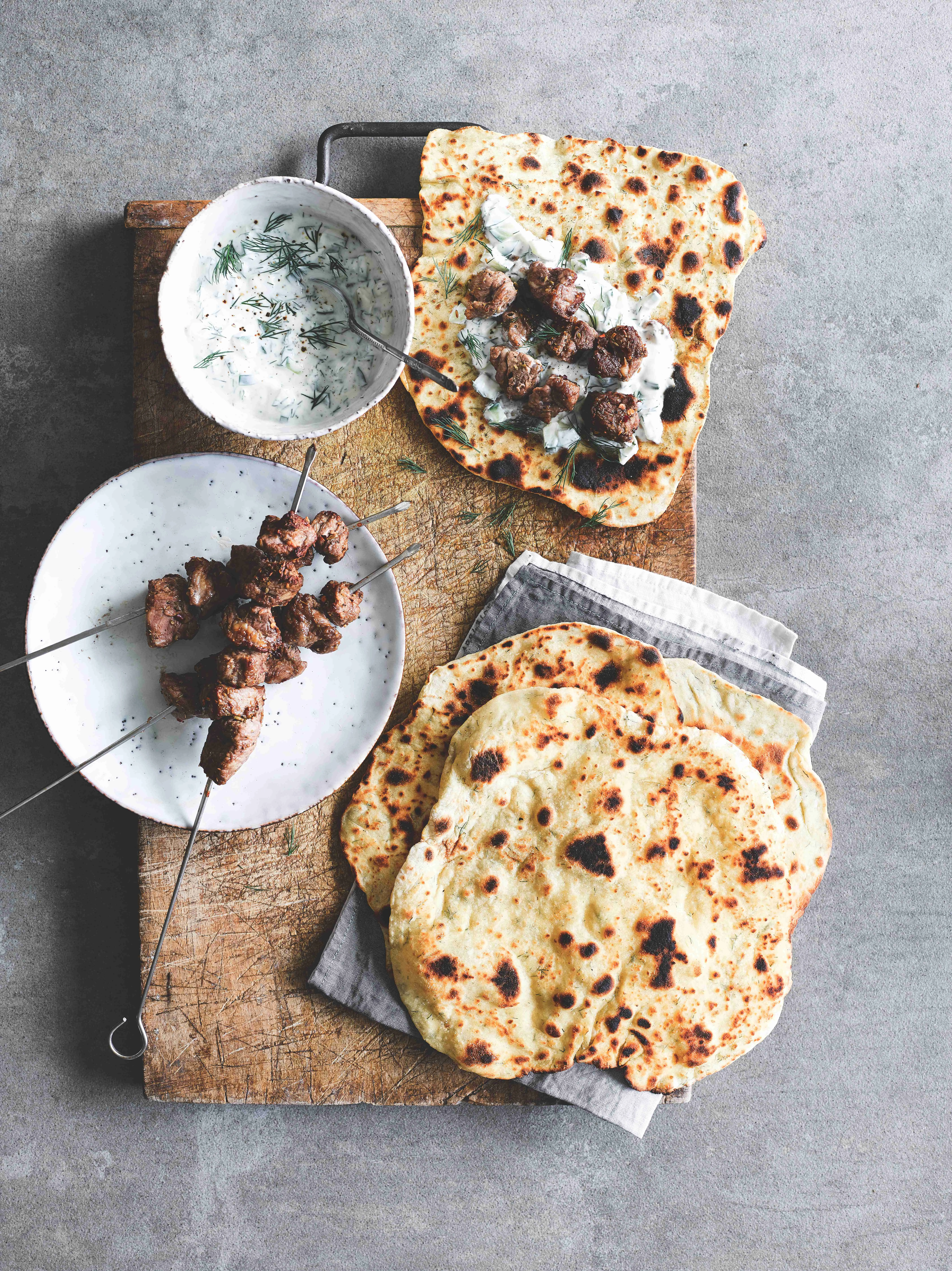 Jehněčí špízy s tzatziki a chlebovými plackami