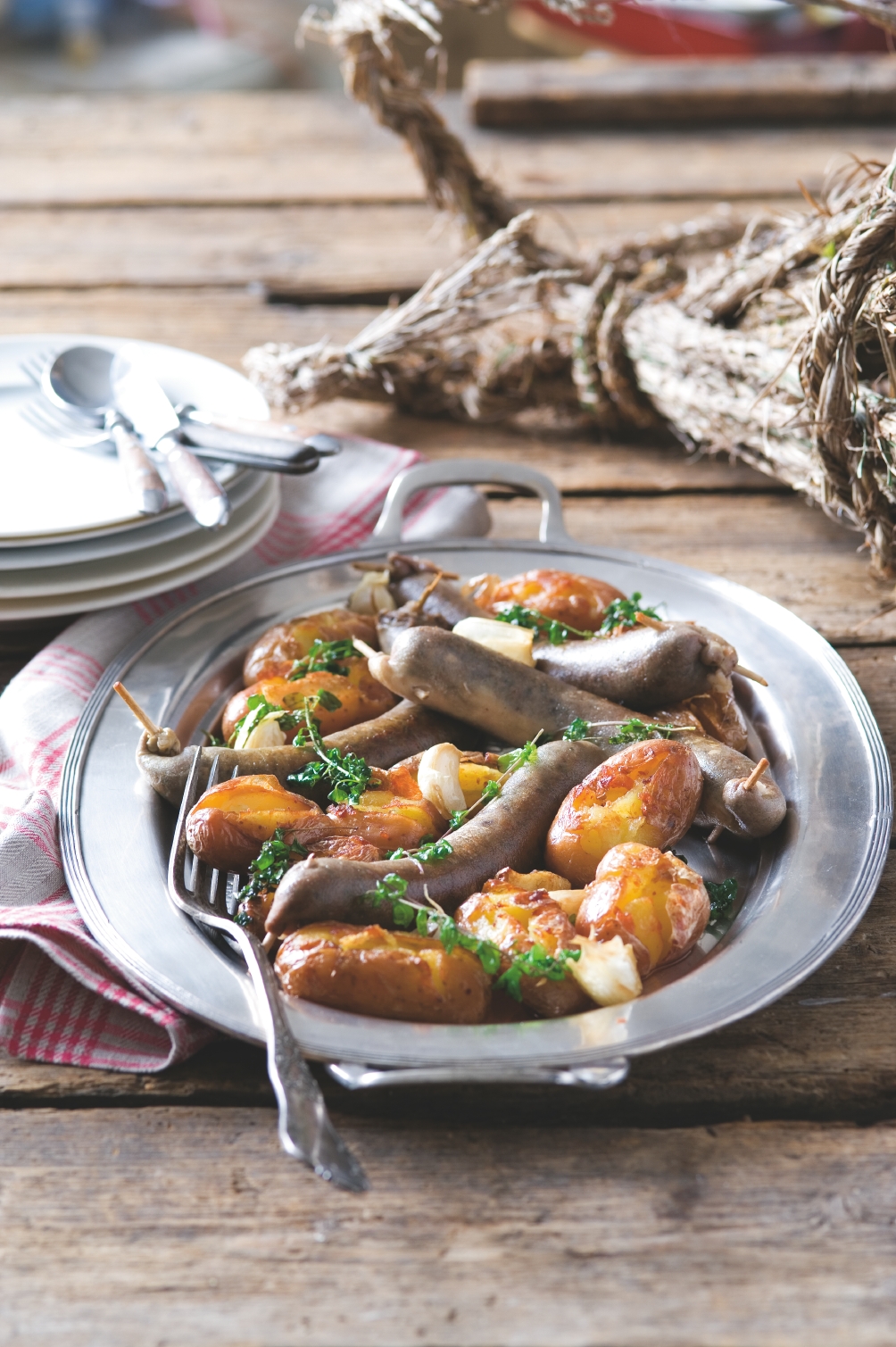 Jitrnice pečené na provoněných bramborách jsou tak skvělé, že zapomenete na kalorické výčitky. A dejte si k nim pořádný půllitr piva! Jen pár ingrediencí a taková dobrota...
