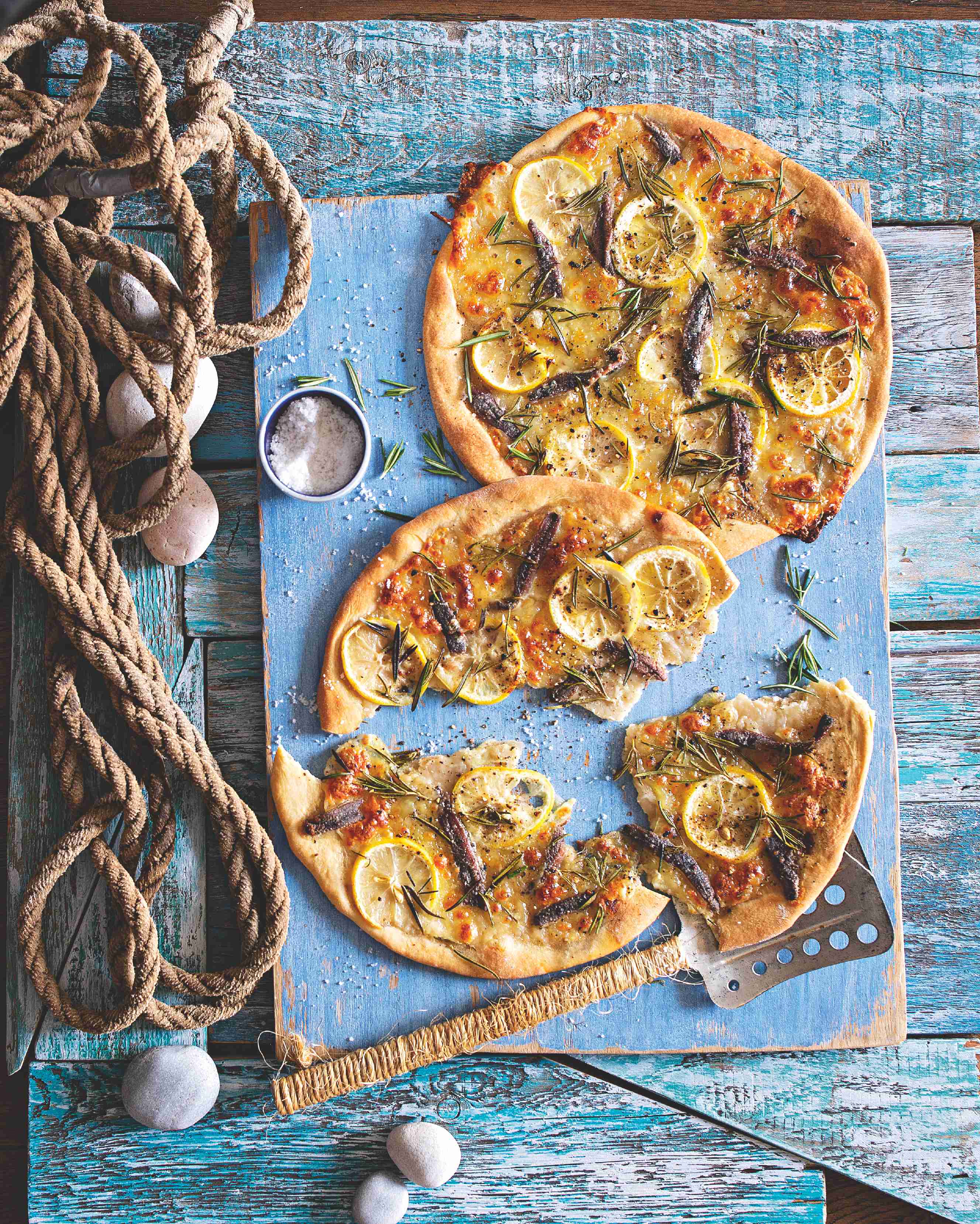K přípravě těsta na jednoduché placky budete potřebovat jen mouku, olivový olej, bílý jogurt, vodů a sůl. S obložením už si můžete vyhrát podle svého. My jsme zvolili ančovičky, mozzarellu a citron. Výsledkem je skvělá chuťovka plná středomořských surovin, kterou můžete přikusovat třeba ke skleničce suchého bílého vína.