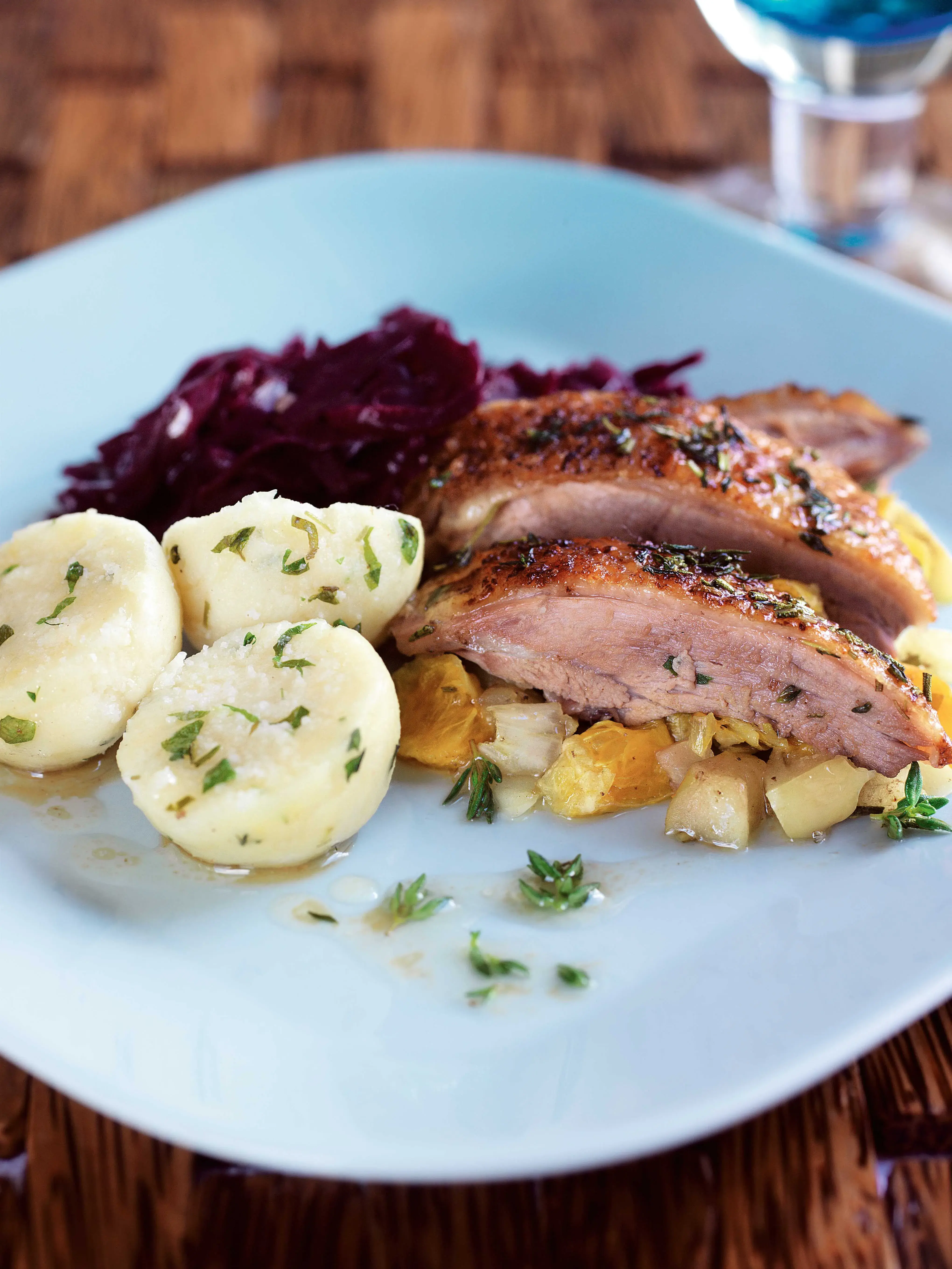 Kachna s červeným zelím v této odlehčené podobě se bude naprosto dokonale vyjímat na slavnostně prostřeném stole. Ale nemusíte péct rovnou celou kachnu, recept je uzpůsobený i pro přípravu ‚pouhých‘ kachních prsíček. S jablky, pomerančem a čerstvými bylinkami.