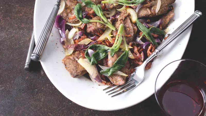 Kachní játra v delikátní úpravě... Se slaninou a šalvějí tvoří dokonalou harmonii chutí.