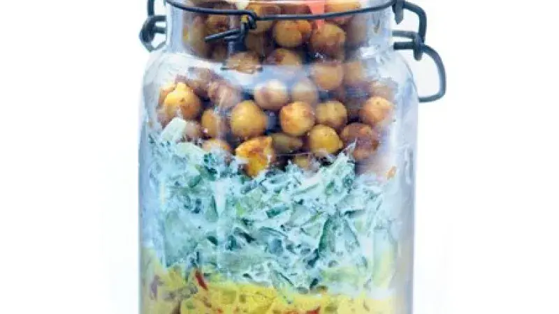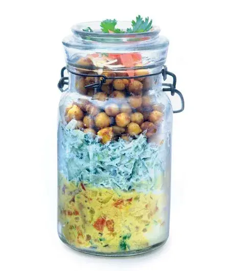 6 Rozdělte do sklenic vrstvu kari kuřete, raity, kořeněné cizrny a ozdobte opraženými mandlovými lupínky, rajčaty a petrželkou.