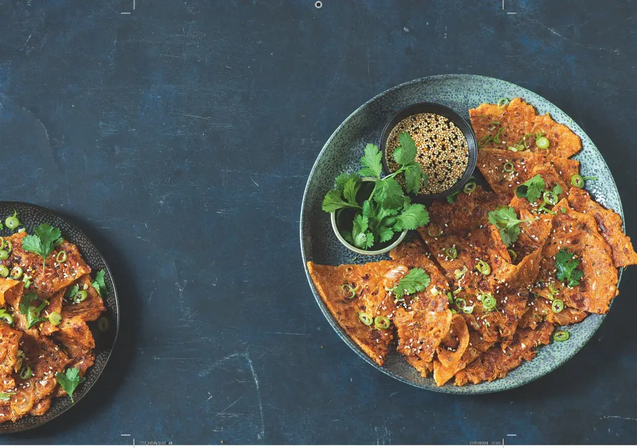 Tenké slané lívance usmažené ke křupavé dokonalosti mají díky kimči až nečekaný říz. Můžete je podávat jako chuťovku nebo jako snídani, která vás postaví na nohy i v případě, že se party trochu protáhla.