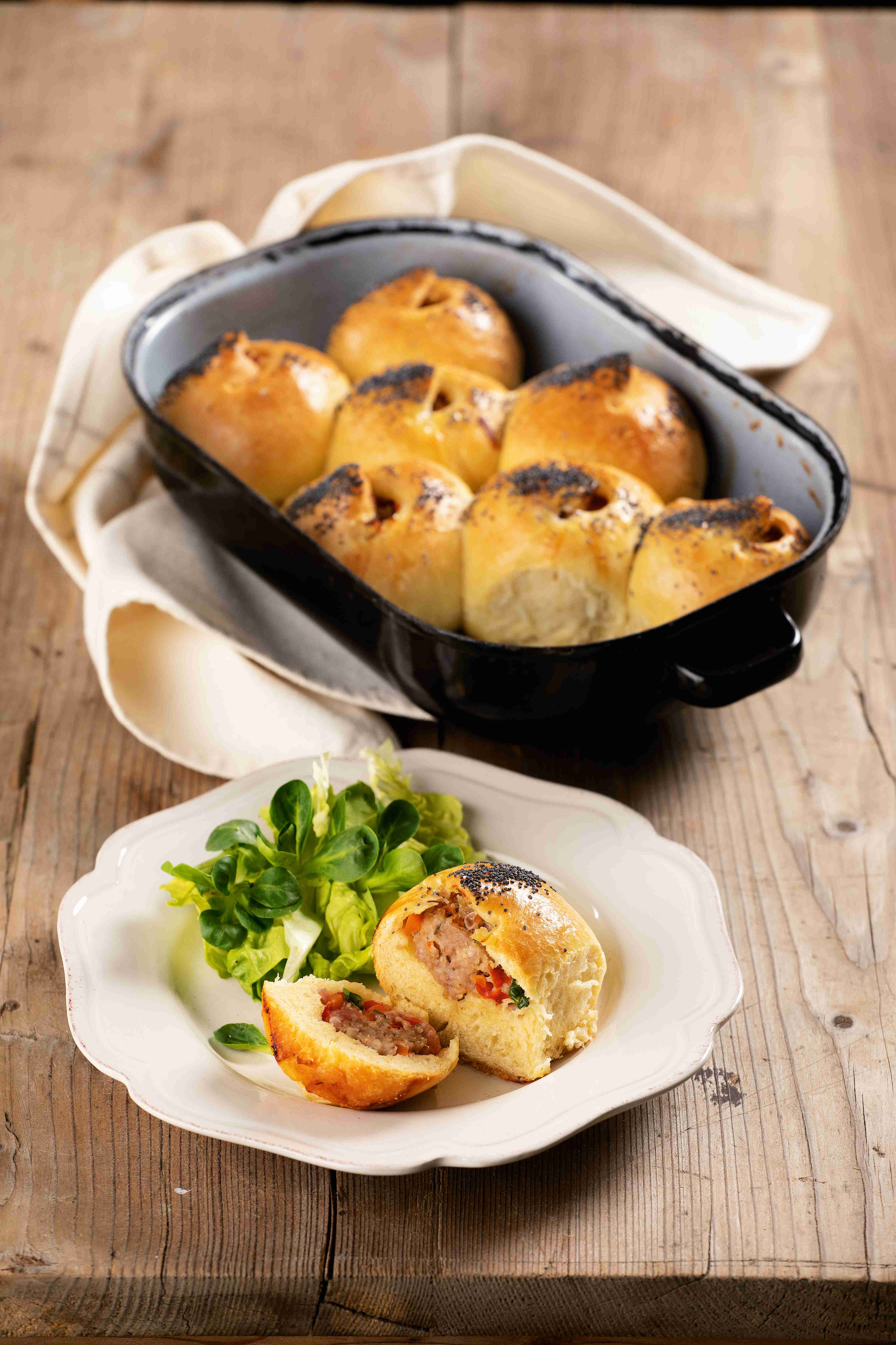 Místo jednotlivých porcí můžete z těsta připravit dva nebo tři tenké záviny. Klobásníky chutnají zatepla i studené.
