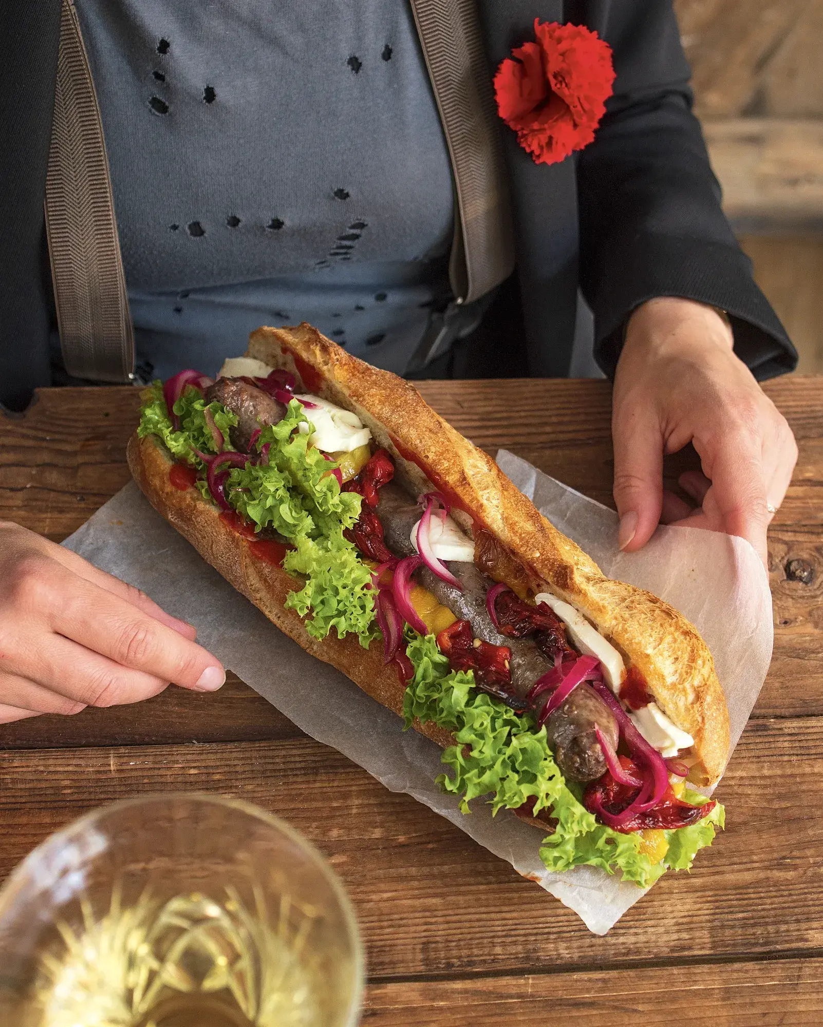 Jak vypadá Kmotr všech sendvičů? Do ciabatty nakládejte natrhaný salát, na něj položte salsicciu, plátky paprik, červenou cibuli a mozzarellu. Přesně to je plněná bagata v italském stylu, která zažene hlad, chutná a ještě připomene mafiánskou filmovou klasiku.