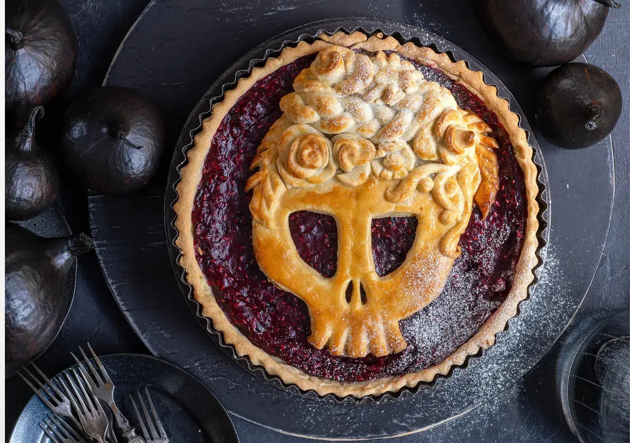 V Mexiku neslaví Halloween, ale dušičkový svátek Día de Muertos. K oslavám patří i maska Catriny, lebky pokryté ozdobami a květy. V koláči ‚Catrina‘ z křehkého těsta a náplně z lesního ovoce jsme vytvořili její sladkou podobu.