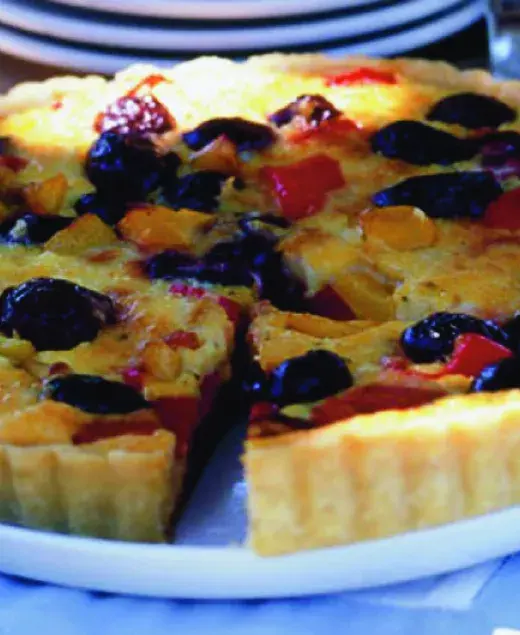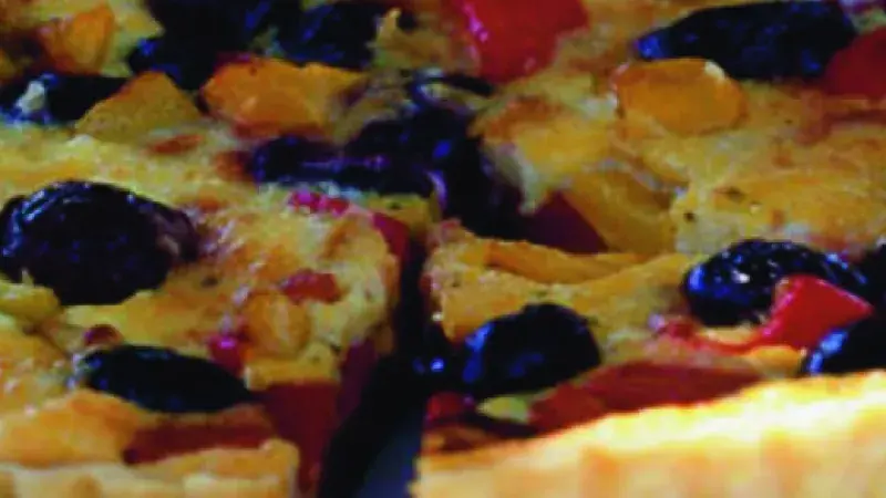 Tenhle úchvatný koláč chutná nejlíp, má-li pokojovou teplotu. Proto si naplánujte jeho pečení tak, aby byl hotový hodinku dvě před podáváním. Vyberte na něj opravdu dobré, baculaté černé olivy.