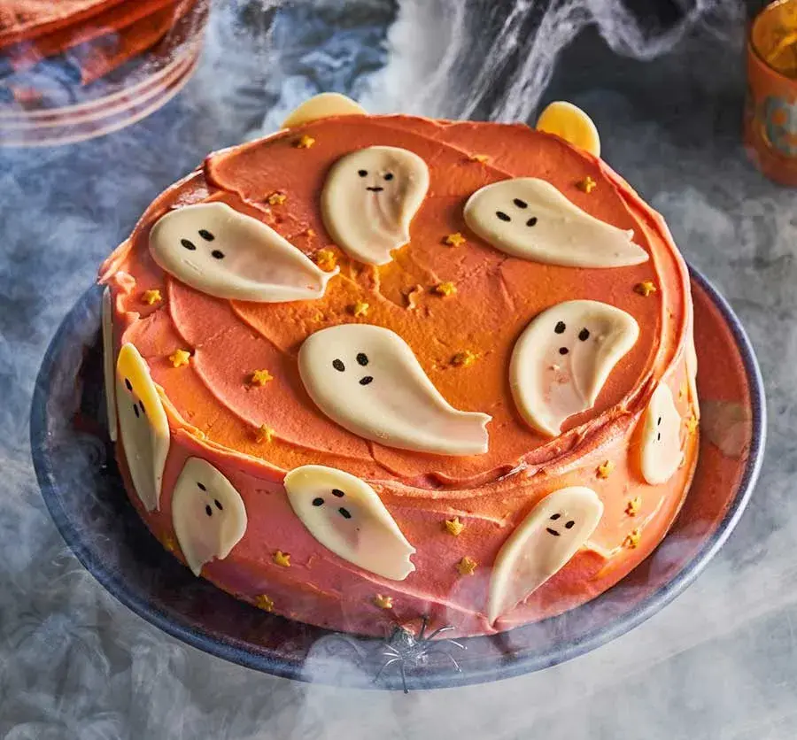 Jak vylepšit podzimní kořeněný dýňový dort? Jednoduše ho oblečte do strašidelného hávu. Oranžovo-růžový krém, duchové z bílé čokolády a cukrové zdobení ho vyladí k dokonalosti. Halloweenská párty může začít!