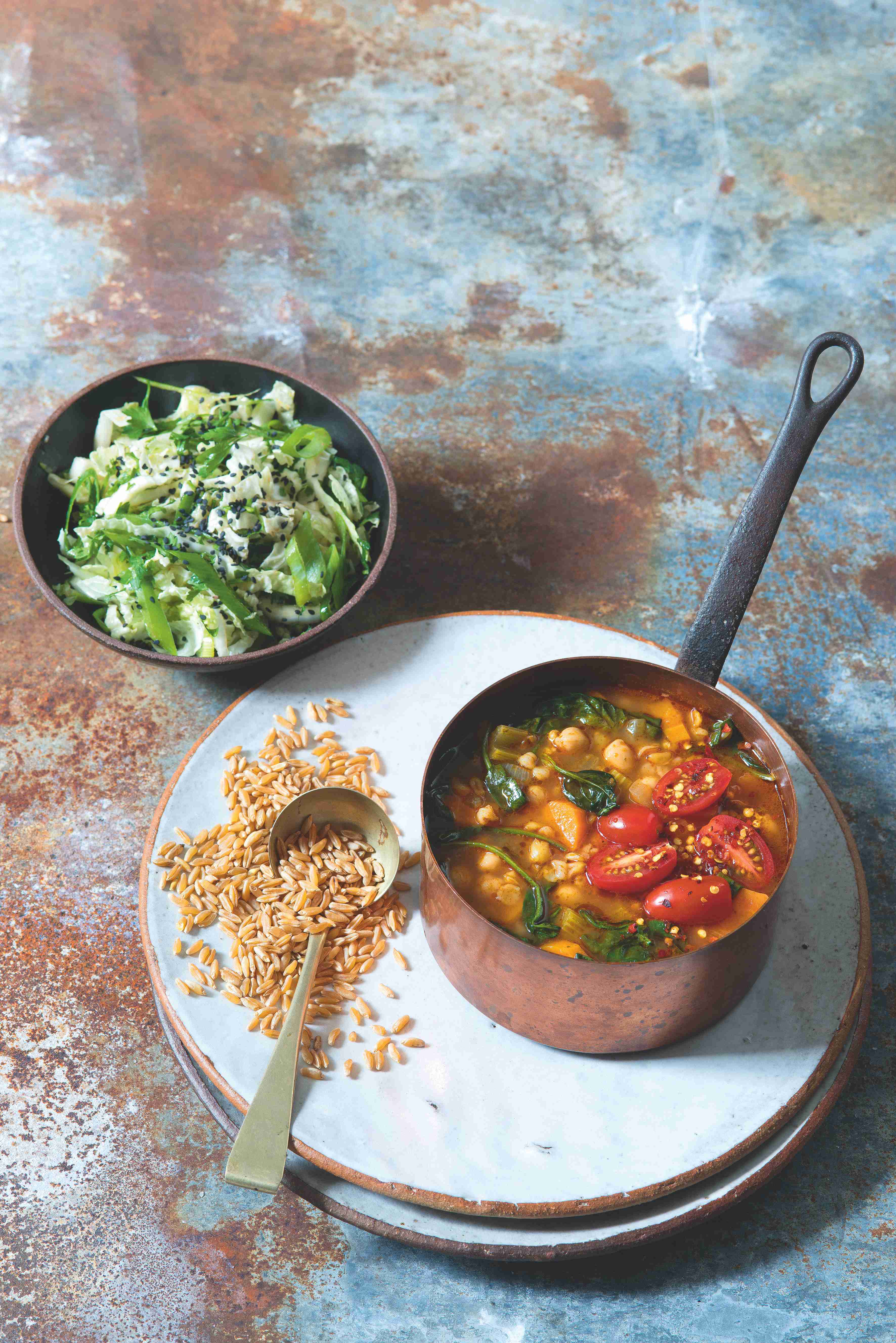 Kamut se botanicky jmenuje pšenice naduřelá, říká se mu také khorasan wheat (chorásánská pšenice, pšenice khorasan). Jedno zrno kamutu je skoro tak velké jako dvě zrna běžné pšenice. Zajímavý je obsahem bílkovin a minerálů a také tím, že se jedná o registrovanou značku, která se pěstuje výhradně v ekologickém zemědělství. Jeho chuť připomíná popcorn. V pokrmu ho můžete nahradit jiným druhem pšenice nebo přírodní či divokou rýží. Křupavý salát nadchl i ty, kdo jinak pekingské zelí úplně nemusejí.