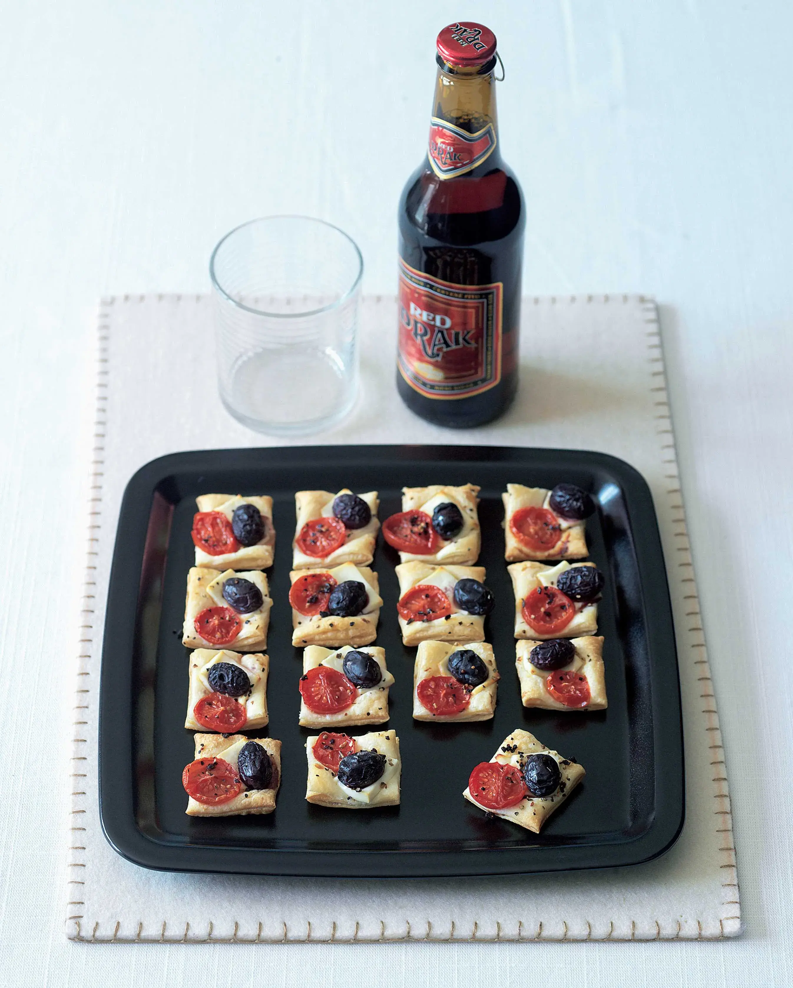 Jednohubky na party i k televizi. K jejich přípravě je potřeba jen pár surovin. Základem tvoří listové těsto, na něm rajčátka, sýr feta a olivy. Před pečením můžete kostky posypat sušenou bazalkou nebo kořením na pizzu.