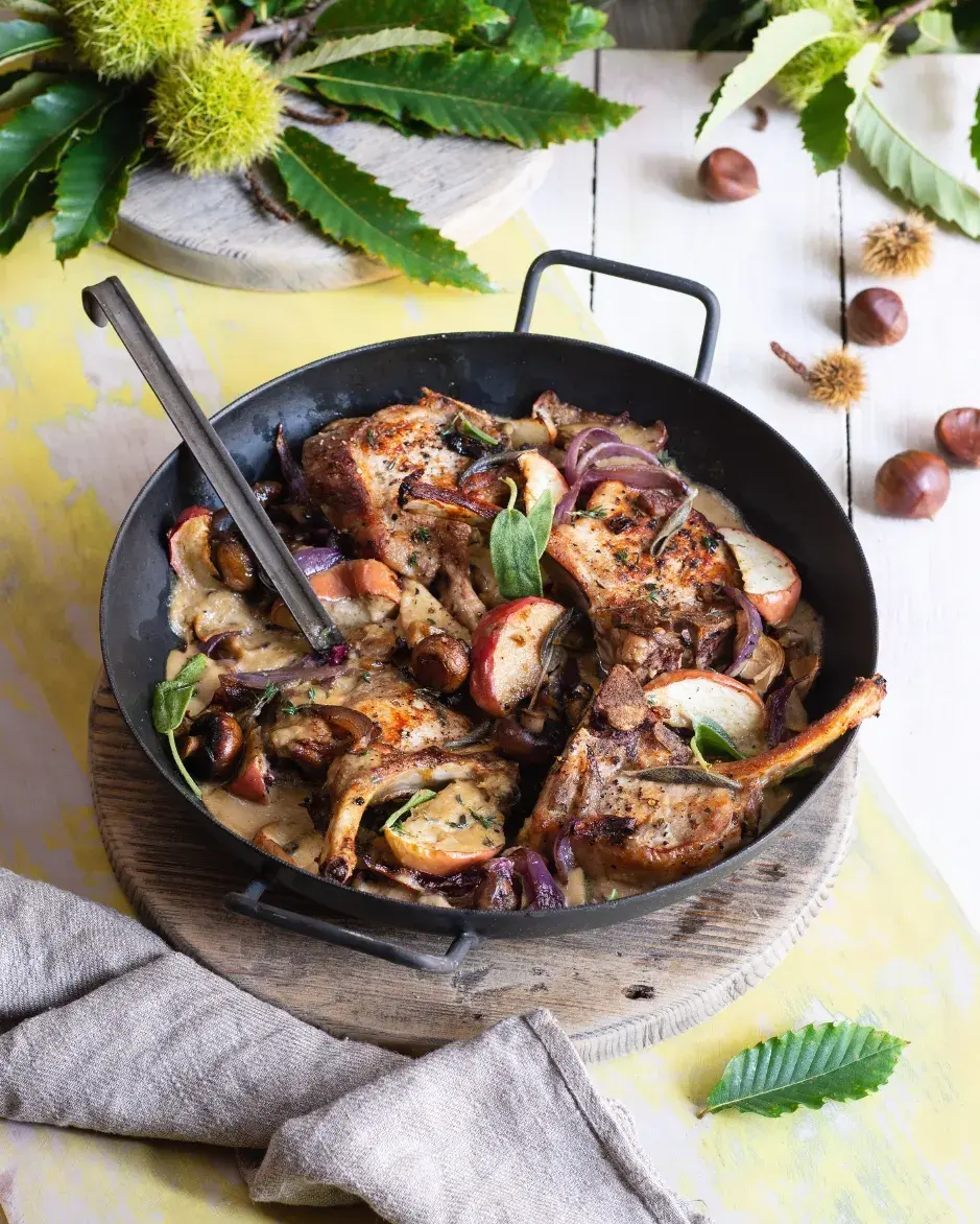 Dokonalejší podzimní oběd než jsou kotlety s houbami a kaštanovo-smetanovou omáčkou byste hledali jen těžko. Pokrm obsahuje téměř vše, co máme na závěru podzimu tolik rádi – houby, jedlé kaštany, jablka a smetanovou omáčku...