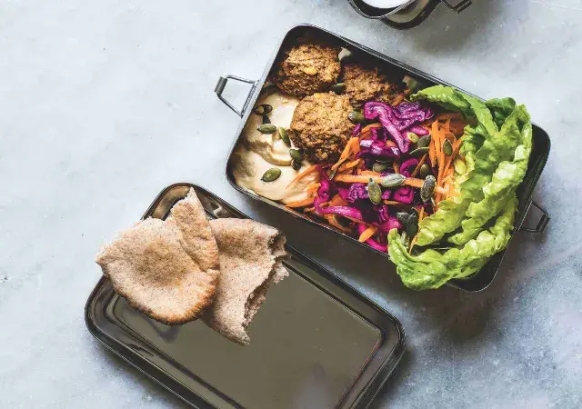 Jednoduchá krabička v blízkovýchodním stylu. Pokud se vyhýbáte lepku, použijte na nabírání hummusu i zelí s mrkví salátové listy.