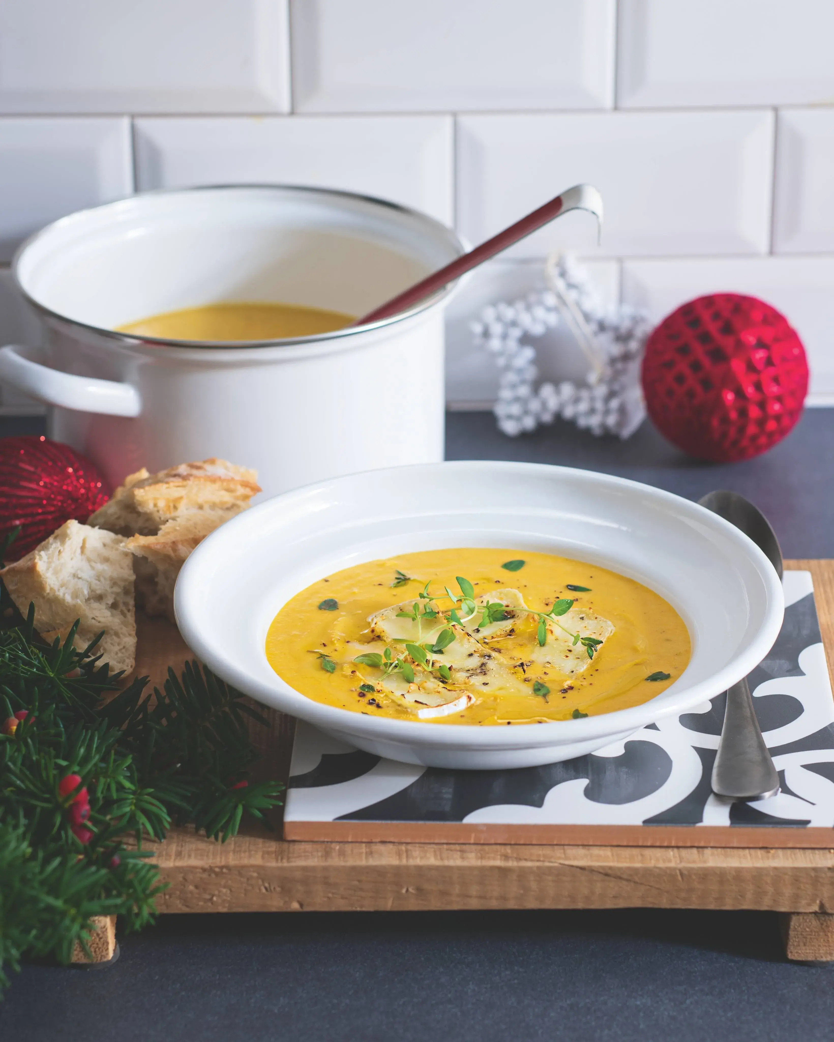 Krémová polévka je vždycky dobrý nápad. Pohladí, potěší a zahřeje. Dodejte jí francouzský šmrnc sýrem brie a čerstvým tymiánem. Bageta k podávání samozřejmě nesmí chybět!