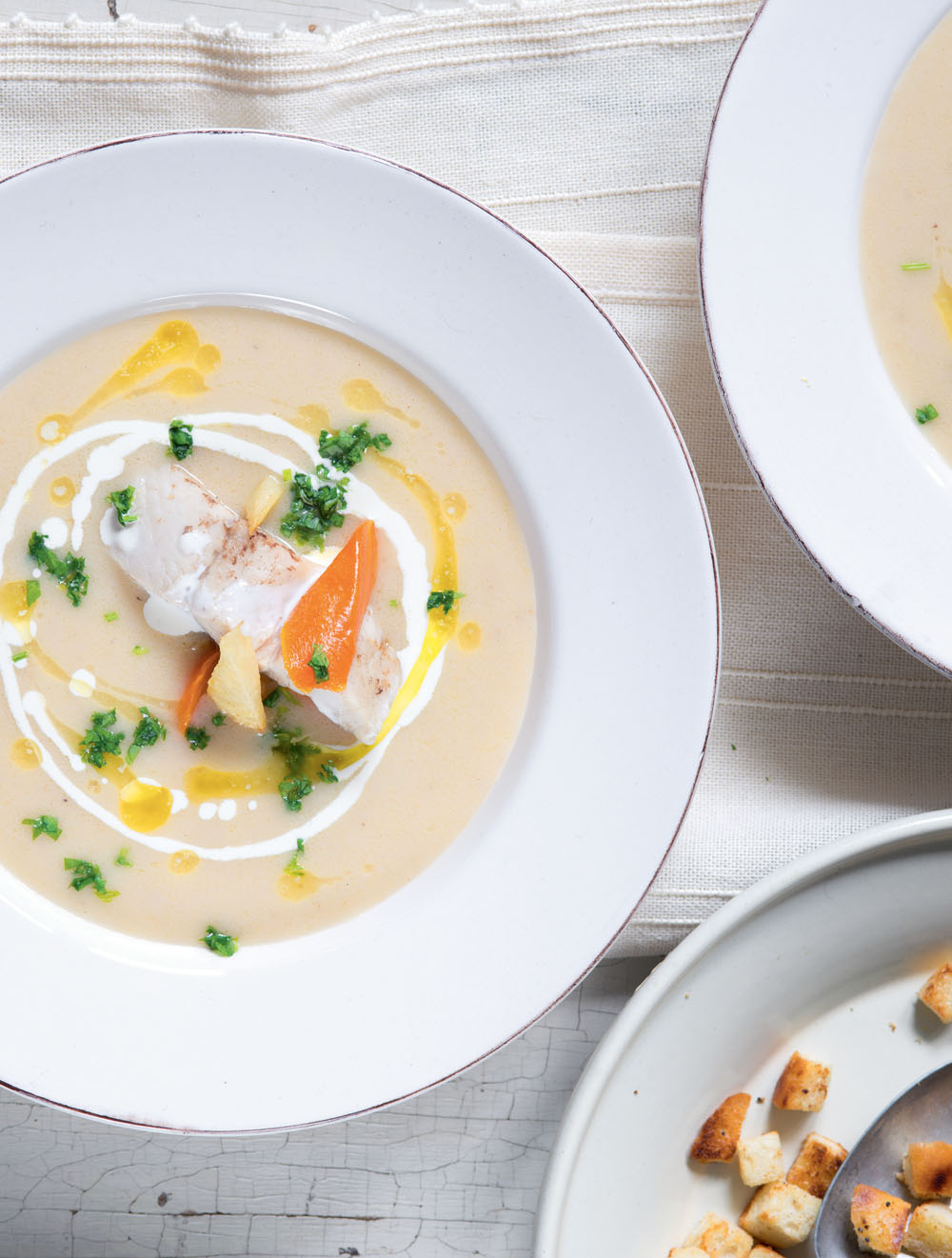 Krémová rybí polévka z kapra podle šéfkuchaře Ondřeje Jíni povznese vaši rodinnou štědrovečerní večeři na novou úroveň. Poctivý rybí vývar, máslová jíška a jemná zelenina se spojí v dokonale harmonickou chuť, která nejen ozdobí váš stůl, ale stane se i jedním z vrcholů svátečního menu. Tak skvělá, že si ji budete chtít připravit nejen na Vánoce!