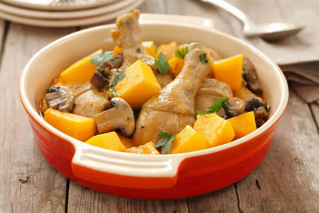 Kuře pečené v krémové omáčce skvěle doplňují silné podzimní chutě hub a dýně.