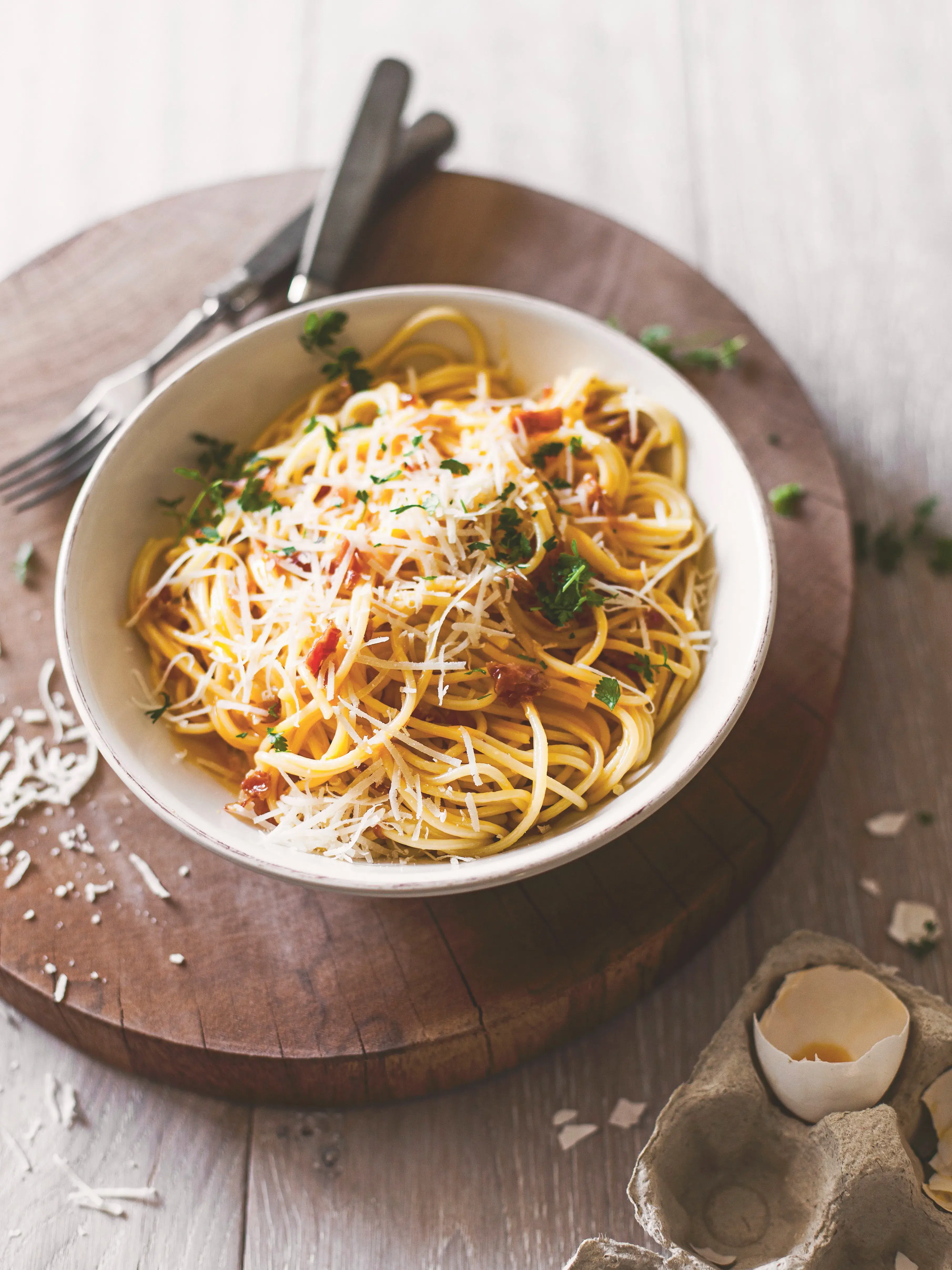 Bezmasá verze špaget carbonara (bez slaniny, pancetty či guanciale) se italsky nazývá pasta cacio e uova. My jsme ji vylepšili přidáním sušených rajčat. Báječný a jednoduchý recept, ideální jako rychlá večeře pro celou rodinu.
