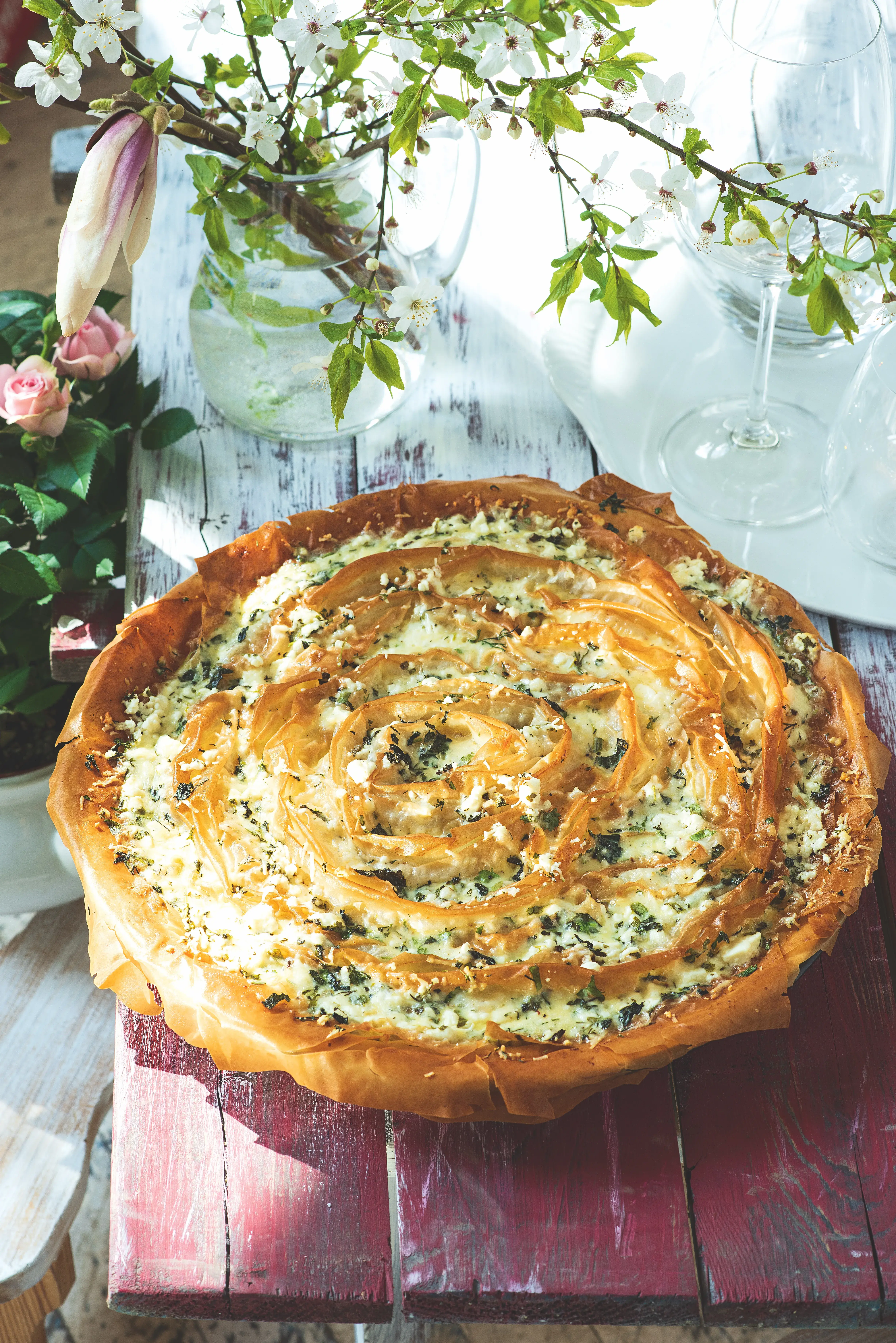 Recept na koláč z filo těsta jsme zahlédli u Yotama Ottolenghiho, koláč nás uchvátil tím, že je naprosto křupavý! Peče se totiž dvakrát – nejdřív samotné těsto, pak teprve s náplní. Trochu jsme upravili techniku skládání těsta: vypadá to složitě, ale určitě to zvládnete.