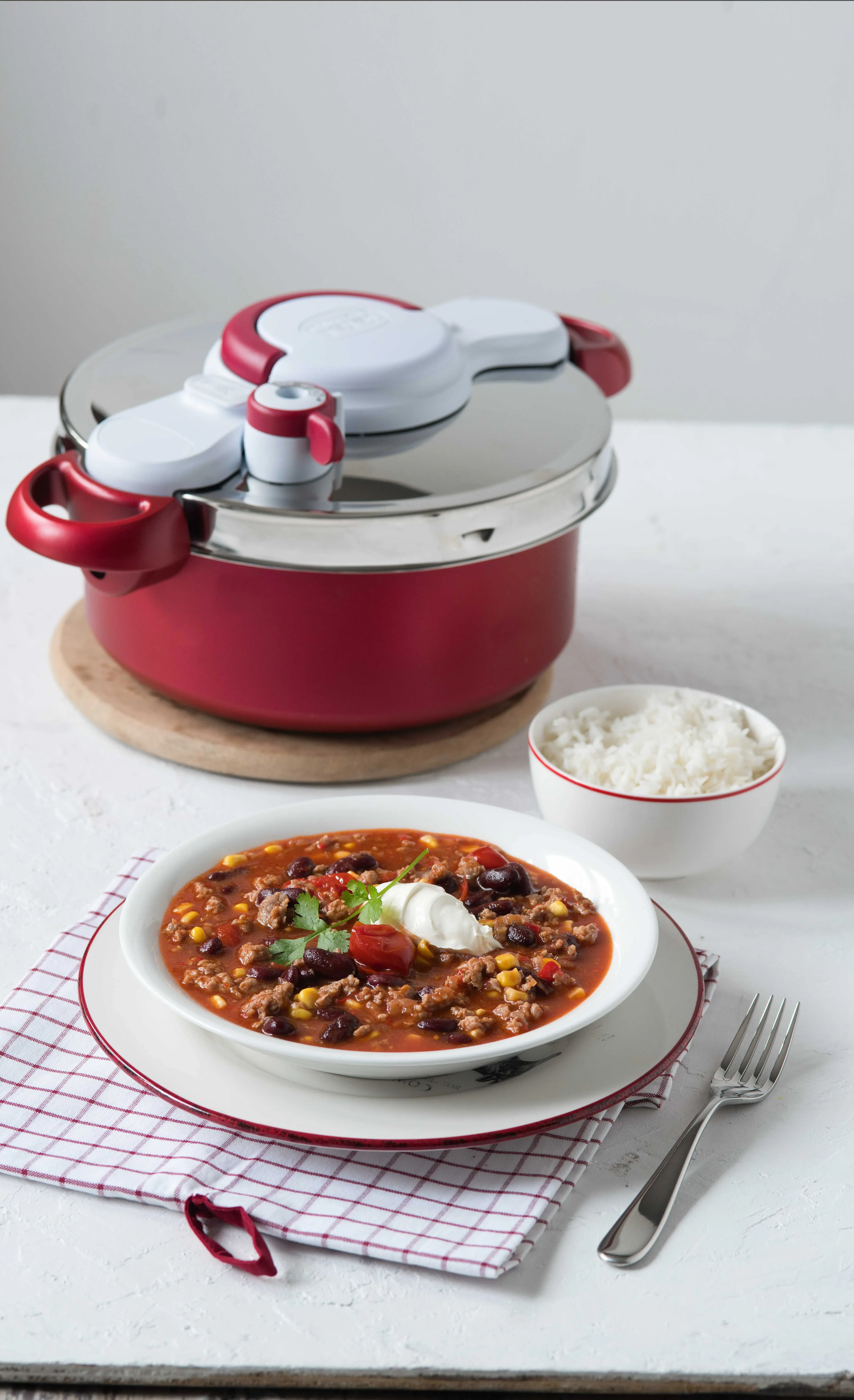 V tlakovém hrnci Tefal ClipsoMinut' Duo připravíte vydatnou večeři pro celou rodinu během chvilky! Vsaďte třeba na lahodné pestré chilli. Do hodiny můžete servírovat!