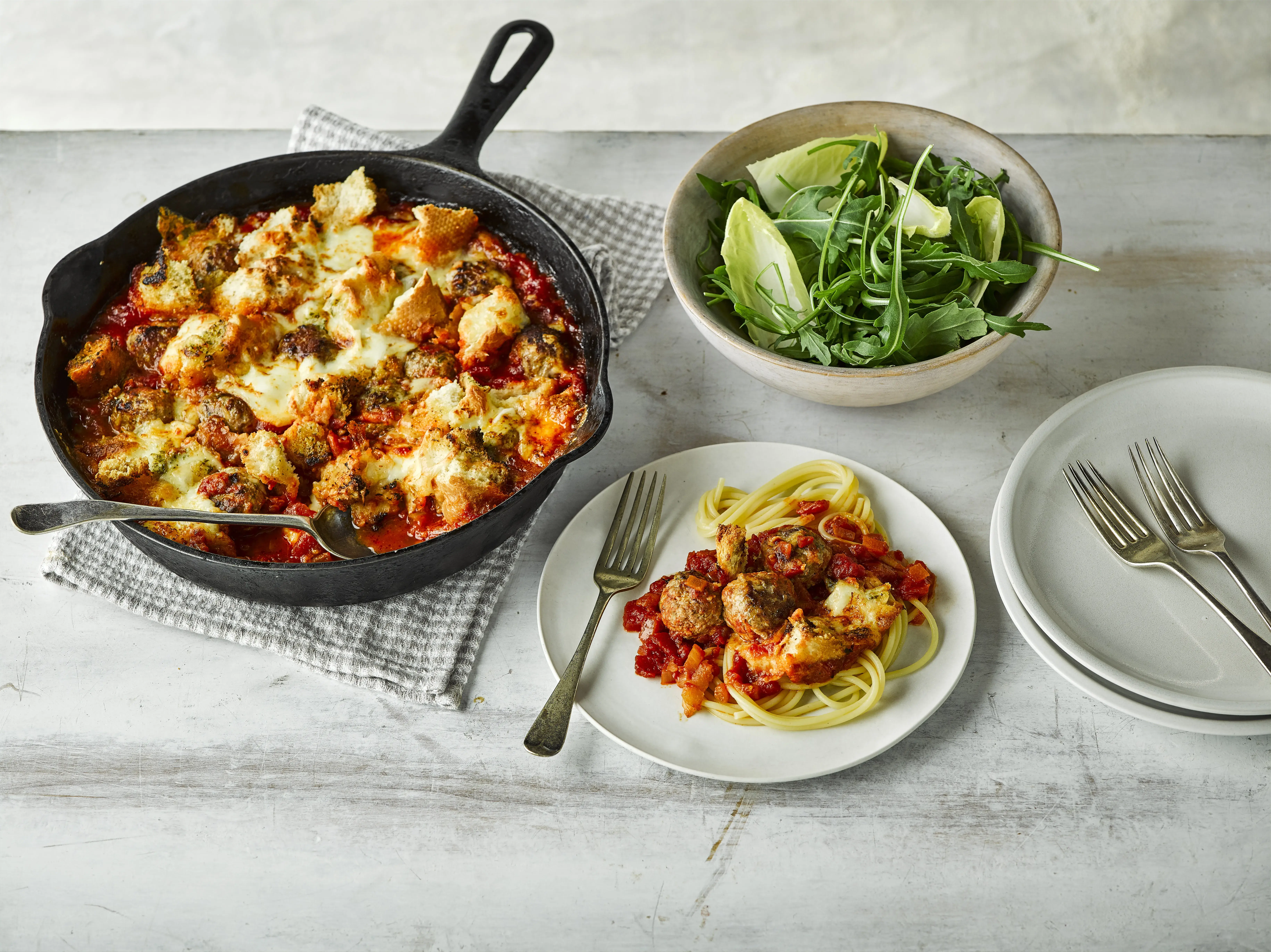 Autor: Redakce, z vydání Apetit Krůtí masové kuličky s česnekovým chlebem z jedné pánve