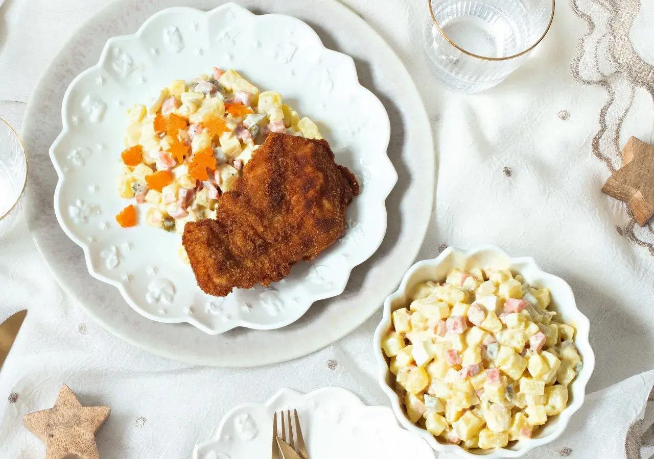 Tradiční bramborový salát a smažený krůtí řízek je pro děti ke štědrovečerní večeři jako stvořený. Aby byl salát pro malé strávníky ještě atraktivnější, můžete z vařené mrkve vykrajovátky vytvořit roztomilé vánoční motivy, jako jsou hvězdičky, stromečky nebo srdíčka. Tím nejen zpestříte servírování, ale také přidáte sváteční atmosféru na dětský talíř.