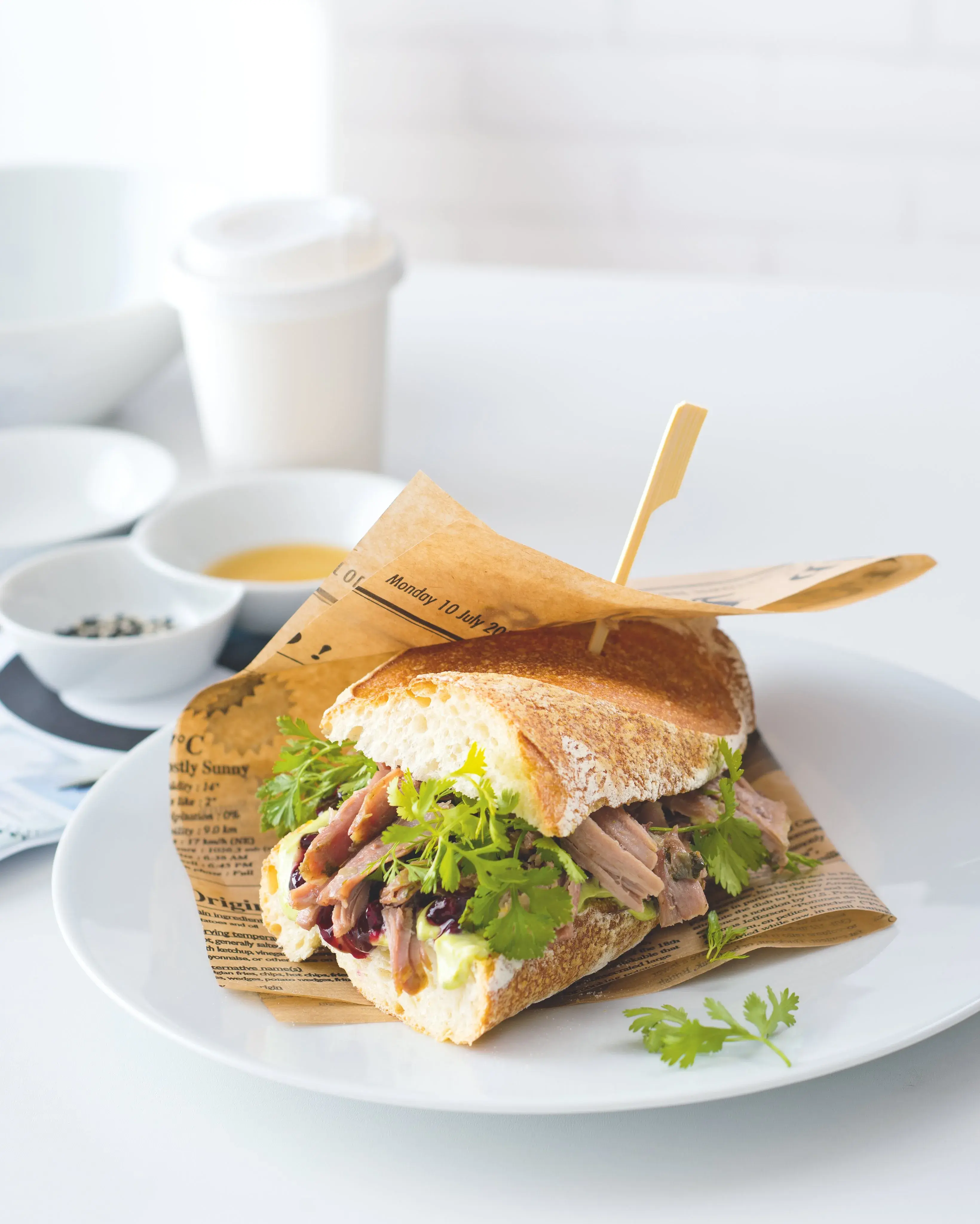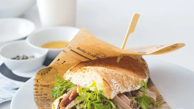 „Recept na tuhle bagetu vznikl vlastně úplnou náhodou, ihned se ale stal evergreenem! Možná i proto, že krůtí stehna zalévám teplým sádlem, ve kterém se právě dopekl bůček...“, říká Karolina Konečná z bistra Proti Proudu.