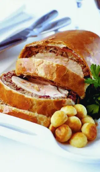 Velmi elegantní variace na téma krocana s kaštanovou nádivkou (na Vánoce je oblíbený nejen v USA, ale i ve Francii, Anglii a Maďarsku)! Jemné krůtí maso získá na šťavnatosti a kaštanová nádivka báječně doladí celkovou chuť.