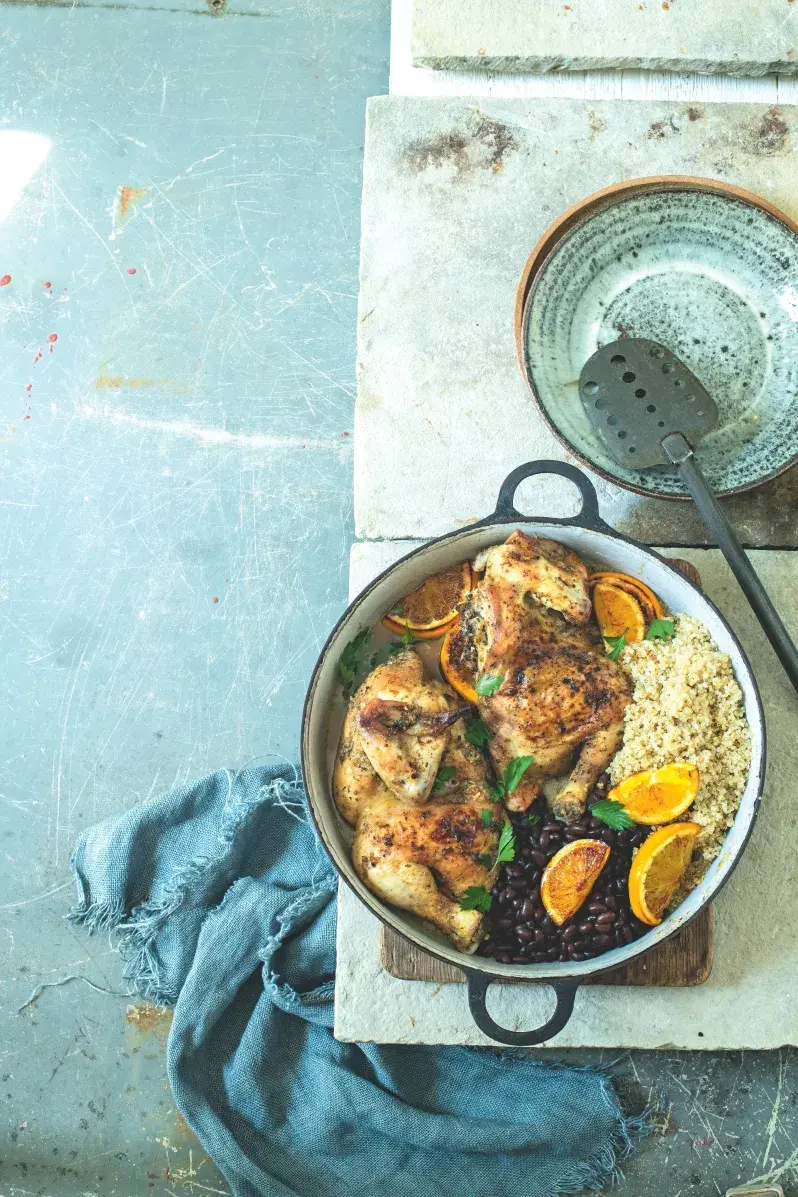 Kubánské kuře vám zaručeně učaruje exotickou chutí a vůní citrusů. V receptu totiž zazáří pomeranče, limety i citrony. Přílohy doporučujeme hned dvě, bílou quinou a černé fazole.